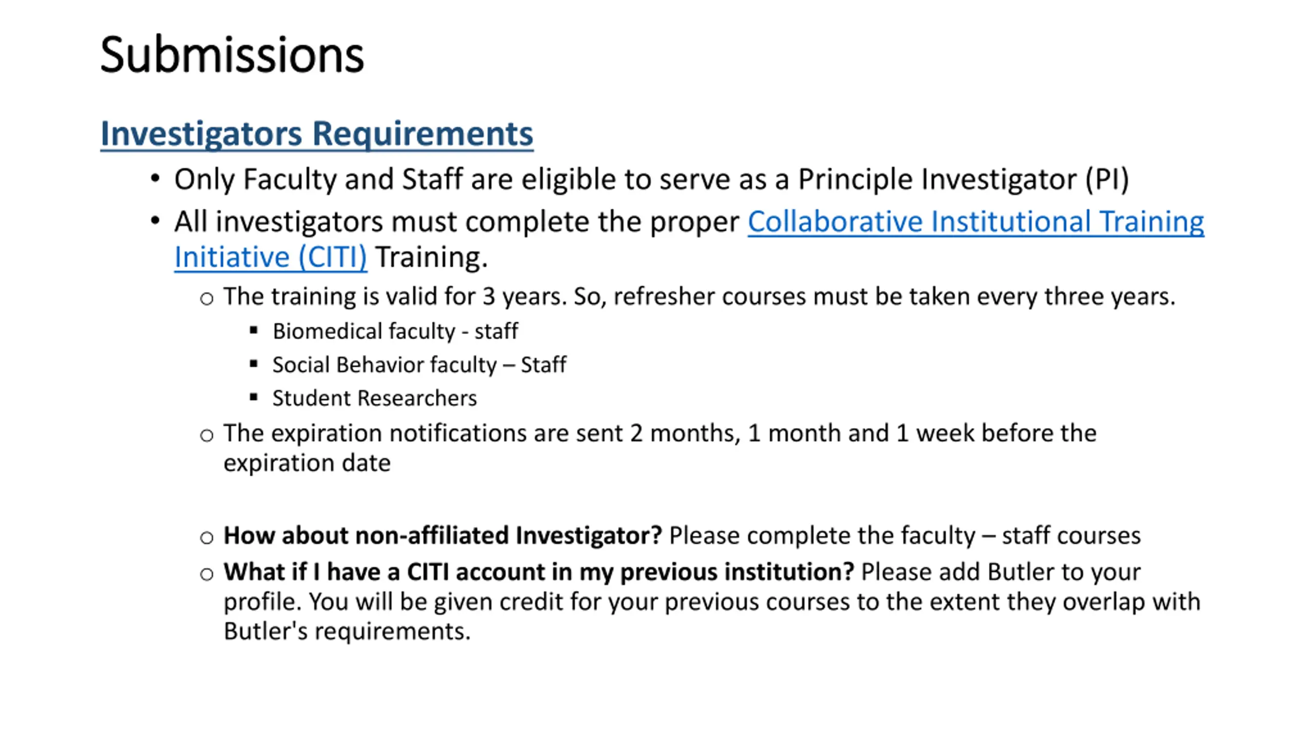 Submissions Submissions Investigators Requirements Only Faculty and Staff are eligible to serve as a Principle Investigator (PI) All investigators must complete the proper Collaborative Institutional Training Initiative (CITI) Training. o The training is valid for 3 years. So, refresher courses must be taken every three years. Biomedical faculty - staff Social Behavior faculty Staff Student Researchers o The expiration notifications are sent 2 months, 1 month and 1 week before the expiration date o How about non-affiliated Investigator? Please complete the faculty staff courses o What if I have a CITI account in my previous institution? Please add Butler to your profile. You will be given credit for your previous courses to the extent they overlap with Butler's requirements.