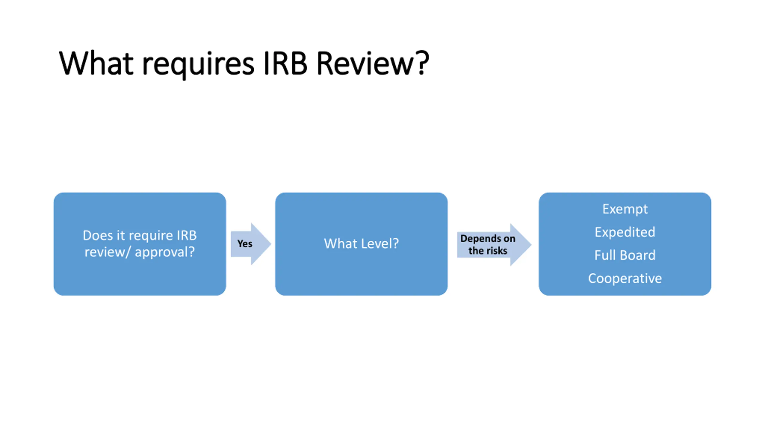 What requires IRB Review? What requires IRB Review? Exempt Expedited Does it require IRB review/ approval? Depends on the risks What Level? Yes Full Board Cooperative