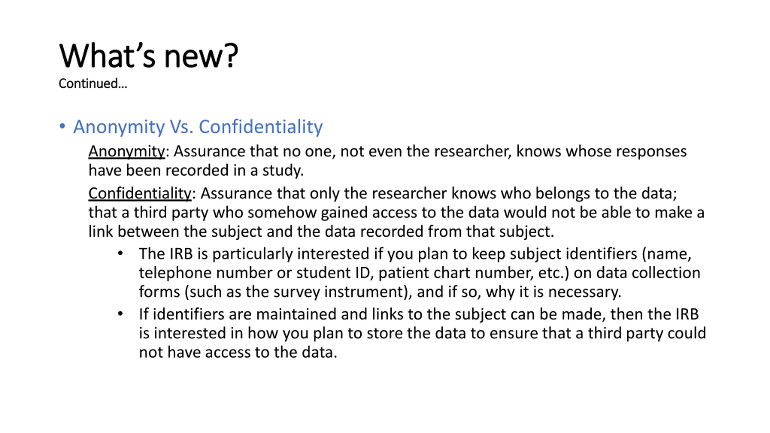 Whats new What s new? ? Continued Continued Anonymity Vs. Confidentiality Anonymity: Assurance that no one, not even the researcher, knows whose responses have been recorded in a study. Confidentiality: Assurance that only the researcher knows who belongs to the data; that a third party who somehow gained access to the data would not be able to make a link between the subject and the data recorded from that subject. The IRB is particularly interested if you plan to keep subject identifiers (name, telephone number or student ID, patient chart number, etc.) on data collection forms (such as the survey instrument), and if so, why it is necessary. If identifiers are maintained and links to the subject can be made, then the IRB is interested in how you plan to store the data to ensure that a third party could not have access to the data.