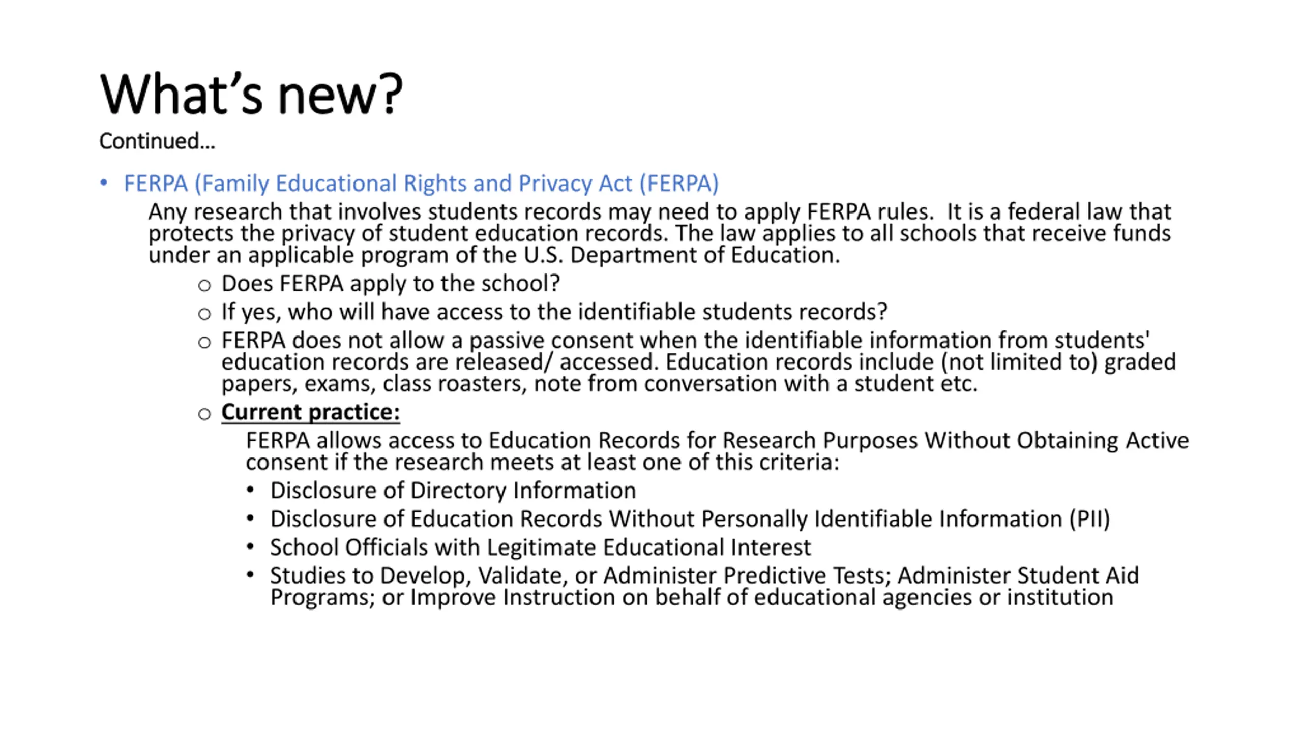Whats new What s new? ? Continued Continued FERPA (Family Educational Rights and Privacy Act (FERPA) Any research that involves students records may need to apply FERPA rules. It is a federal law that protects the privacy of student education records. The law applies to all schools that receive funds under an applicable program of the U.S. Department of Education. o Does FERPA apply to the school? o If yes, who will have access to the identifiable students records? o FERPA does not allow a passive consent when the identifiable information from students' education records are released/ accessed. Education records include (not limited to) graded papers, exams, class roasters, note from conversation with a student etc. o Current practice: FERPA allows access to Education Records for Research Purposes Without Obtaining Active consent if the research meets at least one of this criteria: Disclosure of Directory Information Disclosure of Education Records Without Personally Identifiable Information (PII) School Officials with Legitimate Educational Interest Studies to Develop, Validate, or Administer Predictive Tests; Administer Student Aid Programs; or Improve Instruction on behalf of educational agencies or institution