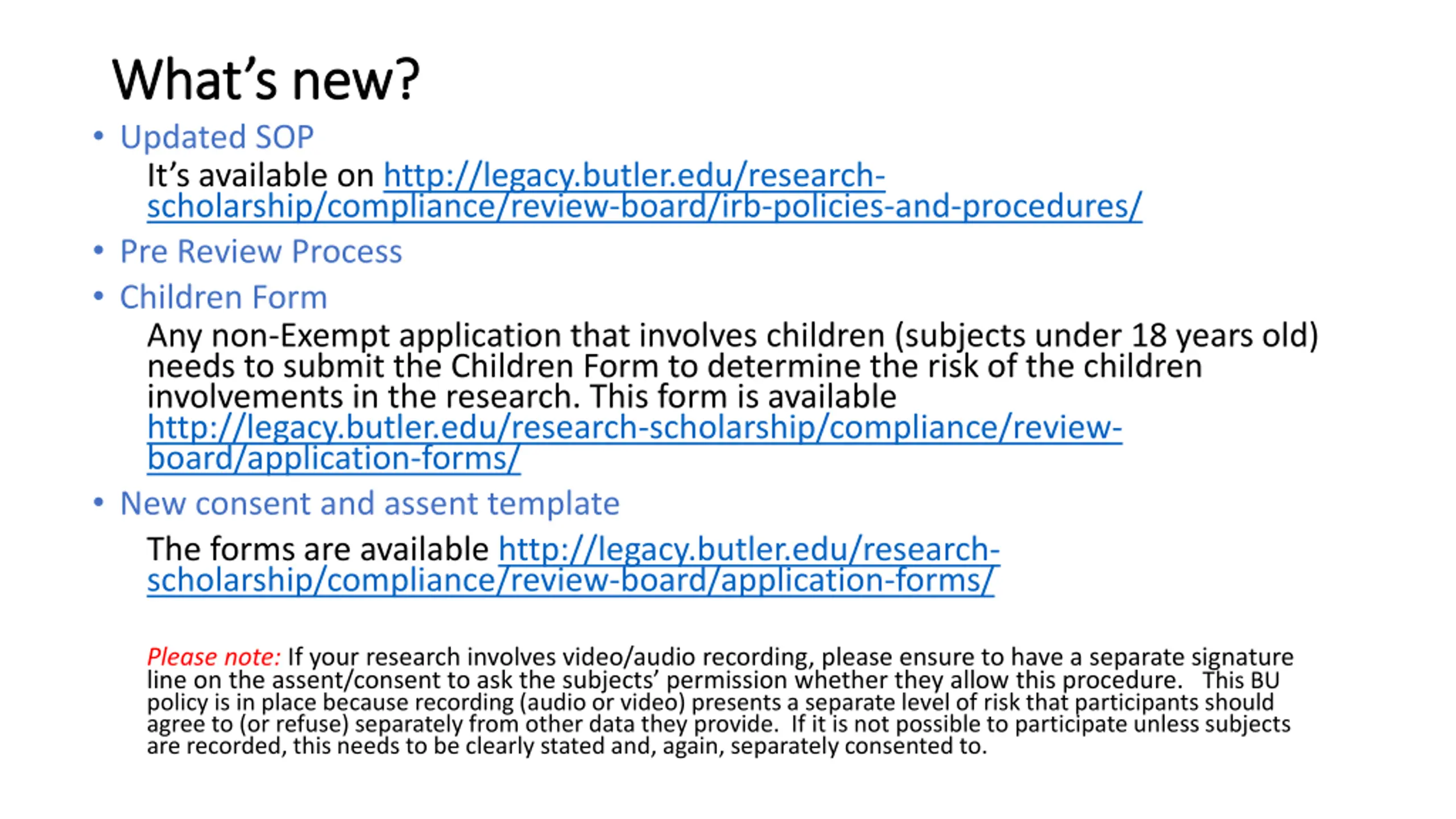 Whats new? What s new? Updated SOP It s available on http://legacy.butler.edu/research- scholarship/compliance/review-board/irb-policies-and-procedures/ Pre Review Process Children Form Any non-Exempt application that involves children (subjects under 18 years old) needs to submit the Children Form to determine the risk of the children involvements in the research. This form is available http://legacy.butler.edu/research-scholarship/compliance/review- board/application-forms/ New consent and assent template The forms are available http://legacy.butler.edu/research- scholarship/compliance/review-board/application-forms/ Please note: If your research involves video/audio recording, please ensure to have a separate signature line on the assent/consent to ask the subjects permission whether they allow this procedure. This BU policy is in place because recording (audio or video) presents a separate level of risk that participants should agree to (or refuse) separately from other data they provide. If it is not possible to participate unless subjects are recorded, this needs to be clearly stated and, again, separately consented to.