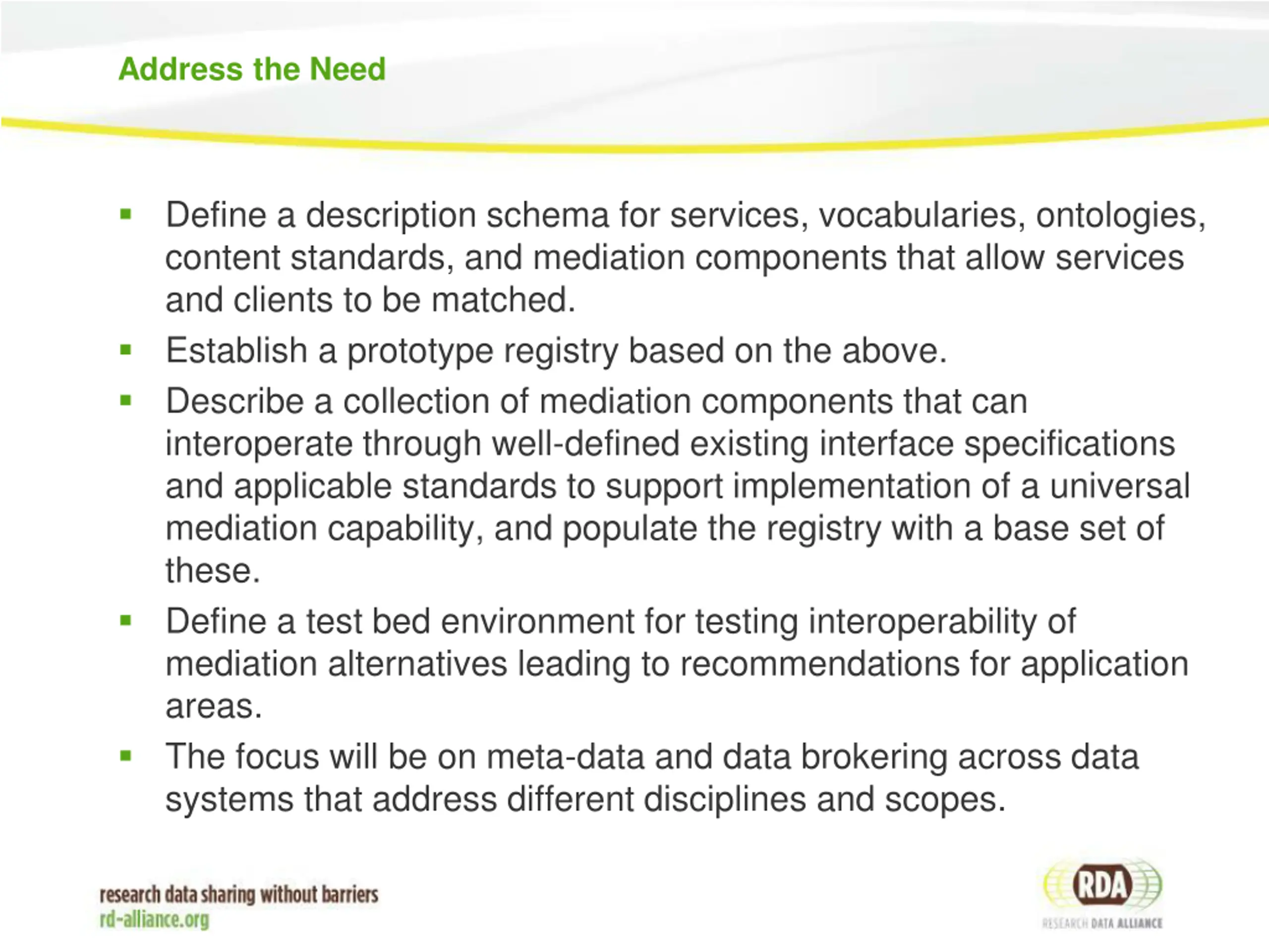 Address the Need Define a description schema for services, vocabularies, ontologies, content standards, and mediation components that allow services and clients to be matched. Establish a prototype registry based on the above. Describe a collection of mediation components that can interoperate through well-defined existing interface specifications and applicable standards to support implementation of a universal mediation capability, and populate the registry with a base set of these. Define a test bed environment for testing interoperability of mediation alternatives leading to recommendations for application areas. The focus will be on meta-data and data brokering across data systems that address different disciplines and scopes.