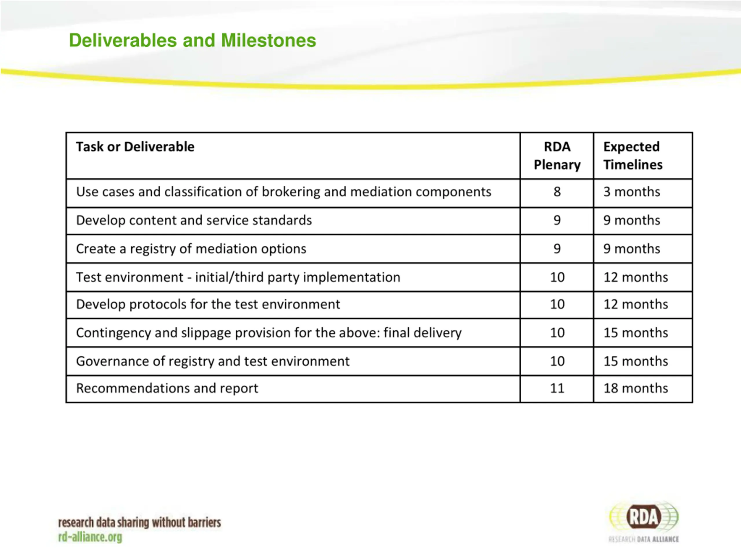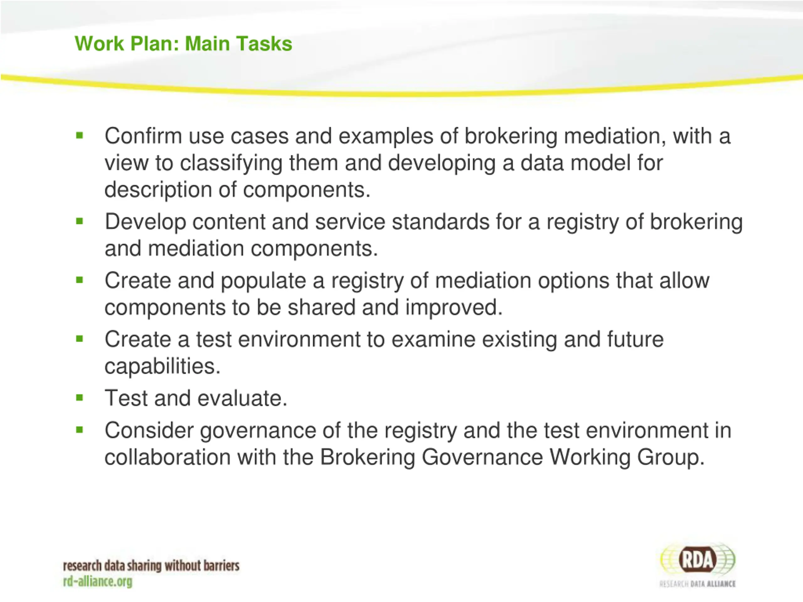 Work Plan: Main Tasks Confirm use cases and examples of brokering mediation, with a view to classifying them and developing a data model for description of components. Develop content and service standards for a registry of brokering and mediation components. Create and populate a registry of mediation options that allow components to be shared and improved. Create a test environment to examine existing and future capabilities. Test and evaluate. Consider governance of the registry and the test environment in collaboration with the Brokering Governance Working Group.
