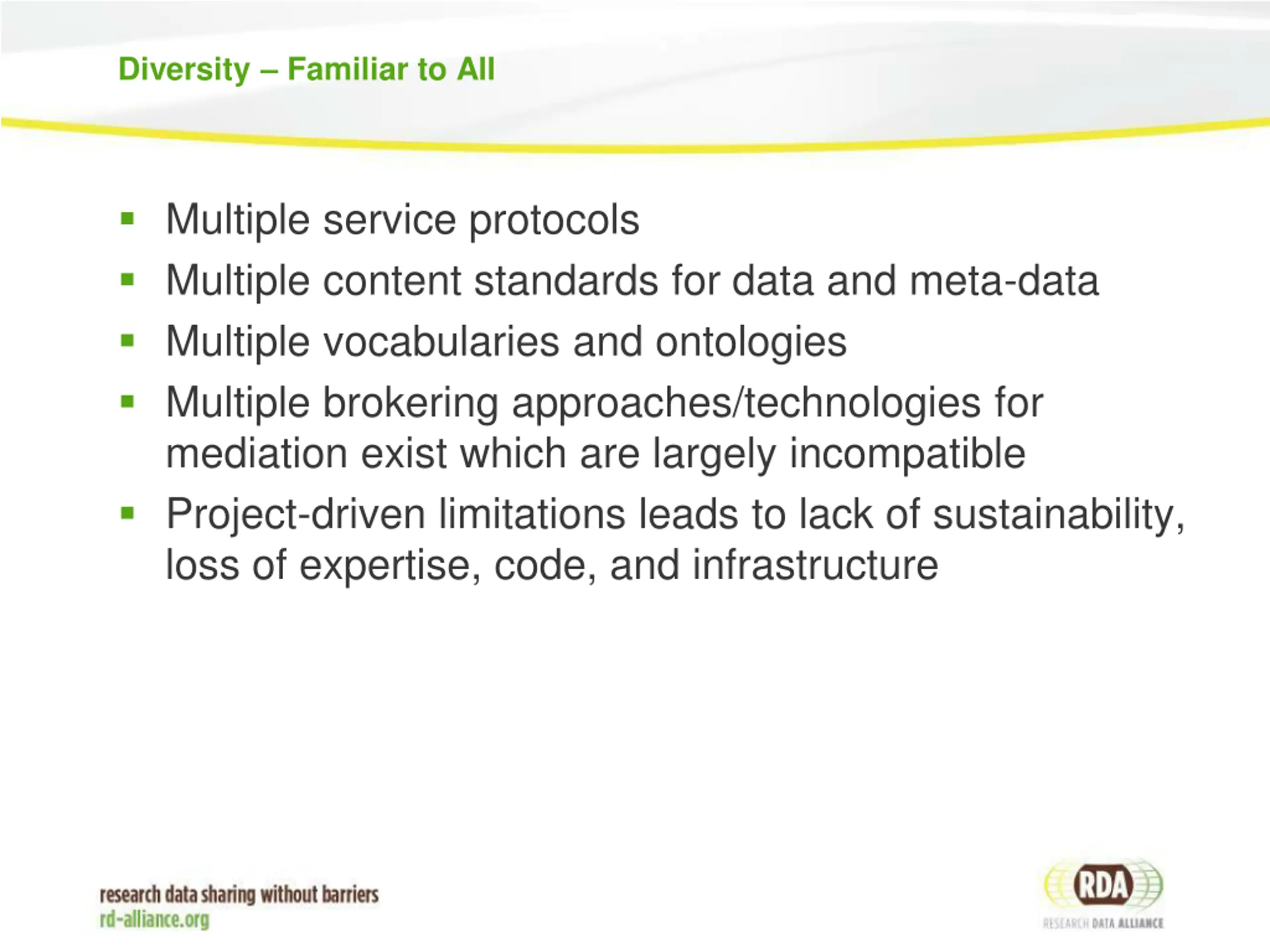Diversity Familiar to All Multiple service protocols Multiple content standards for data and meta-data Multiple vocabularies and ontologies Multiple brokering approaches/technologies for mediation exist which are largely incompatible Project-driven limitations leads to lack of sustainability, loss of expertise, code, and infrastructure
