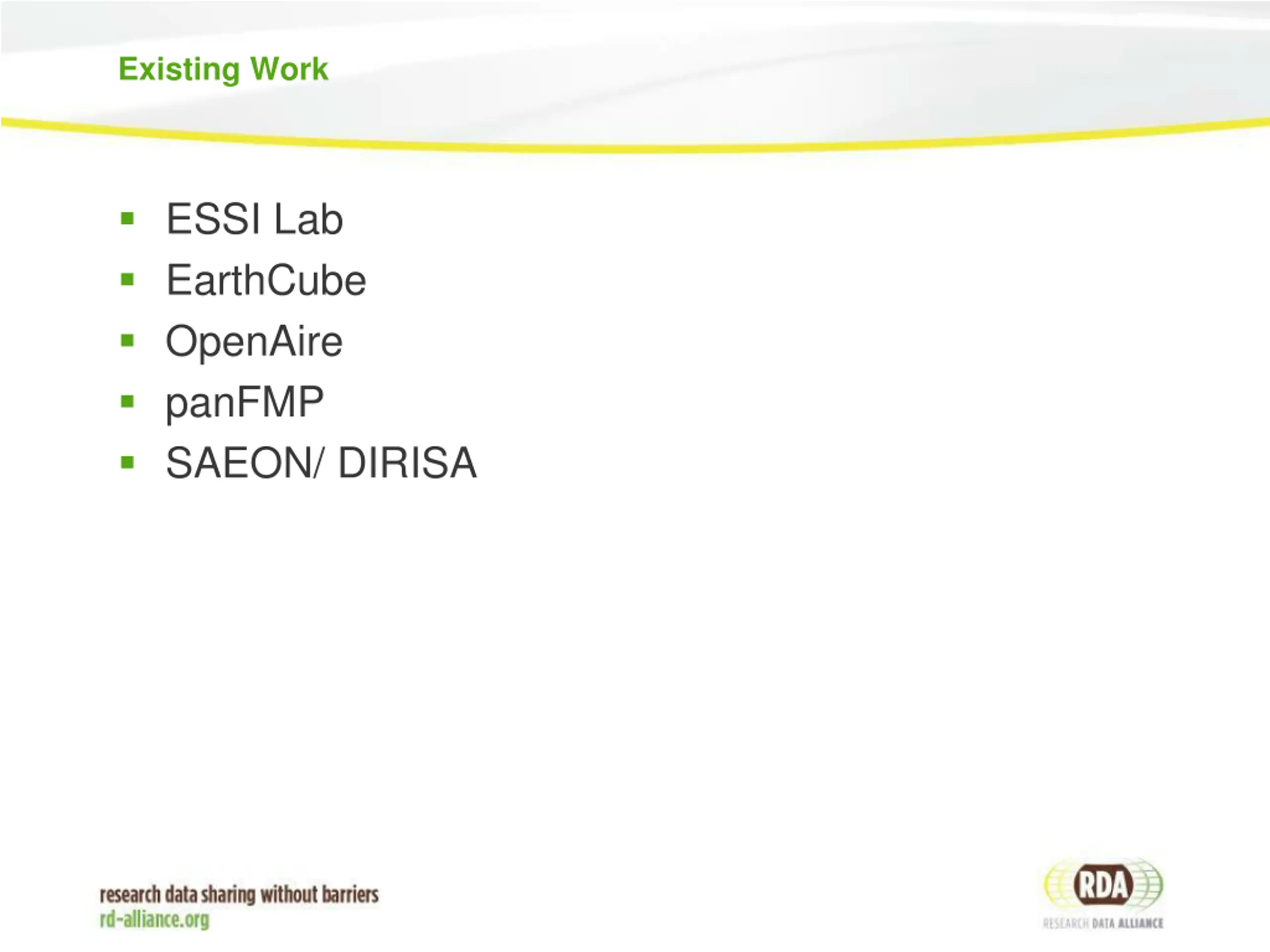 Existing Work ESSI Lab EarthCube OpenAire panFMP SAEON/ DIRISA