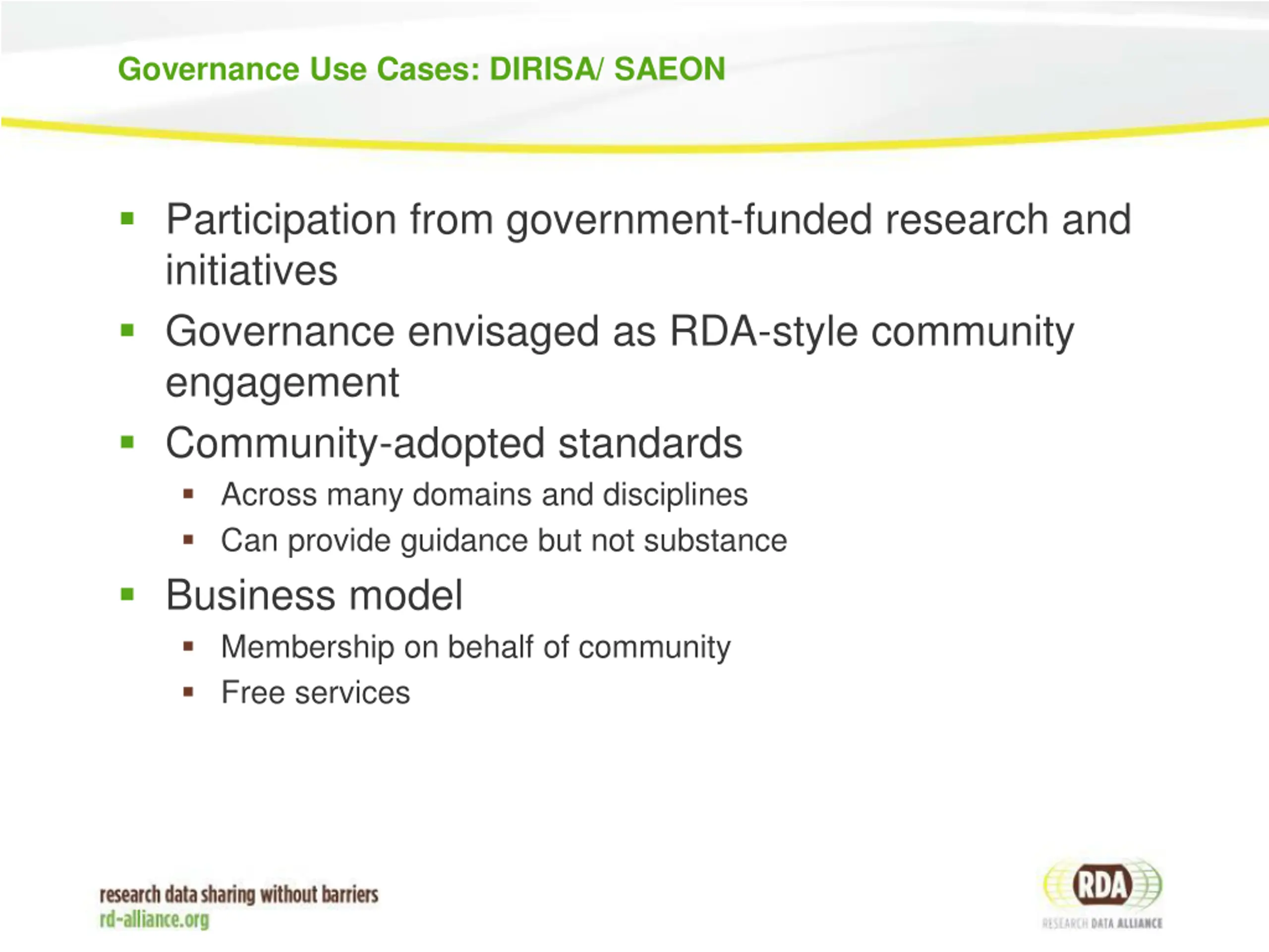 Governance Use Cases: DIRISA/ SAEON Participation from government-funded research and initiatives Governance envisaged as RDA-style community engagement Community-adopted standards Across many domains and disciplines Can provide guidance but not substance Business model Membership on behalf of community Free services