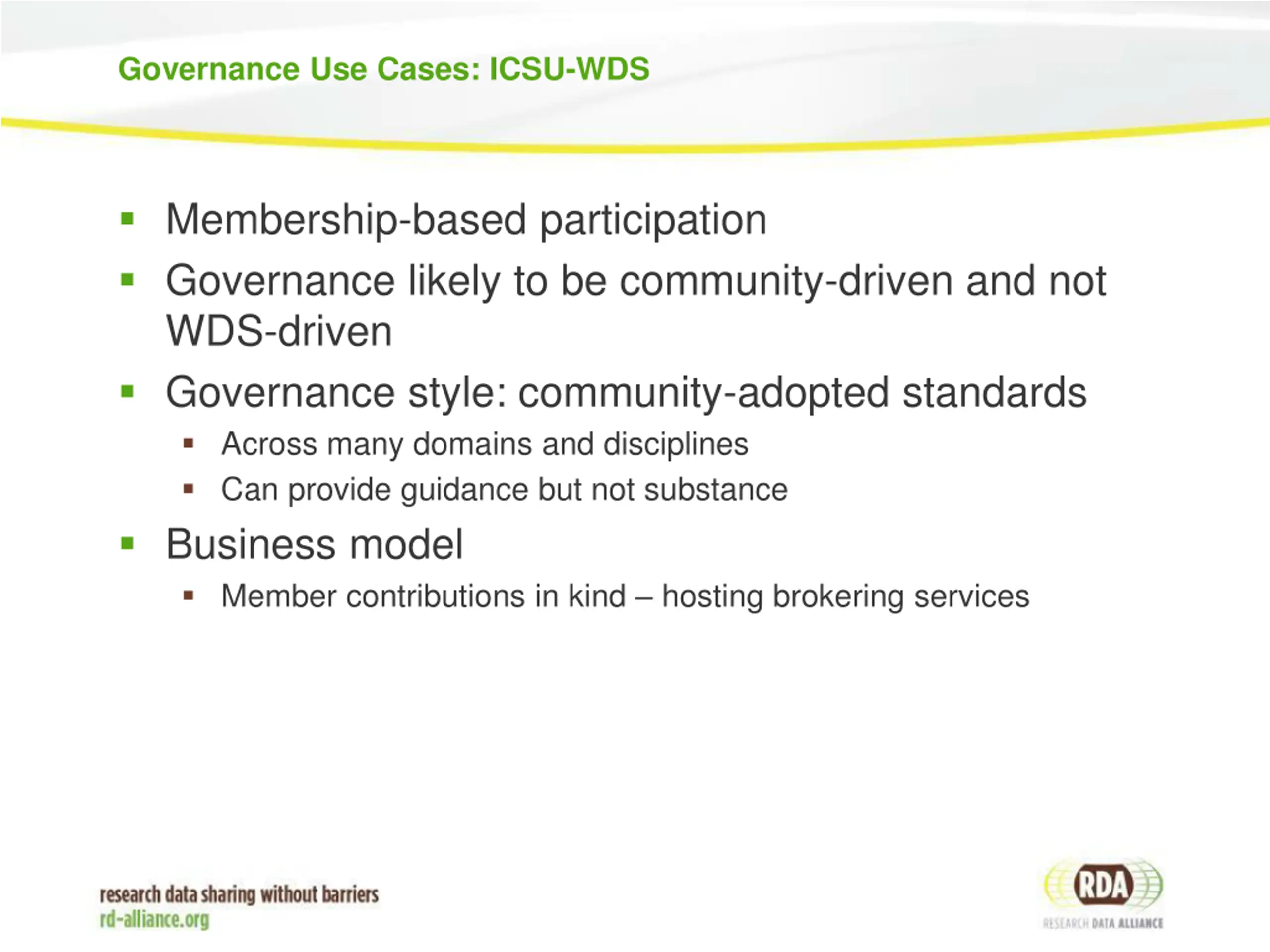 Governance Use Cases: ICSU-WDS Membership-based participation Governance likely to be community-driven and not WDS-driven Governance style: community-adopted standards Across many domains and disciplines Can provide guidance but not substance Business model Member contributions in kind hosting brokering services