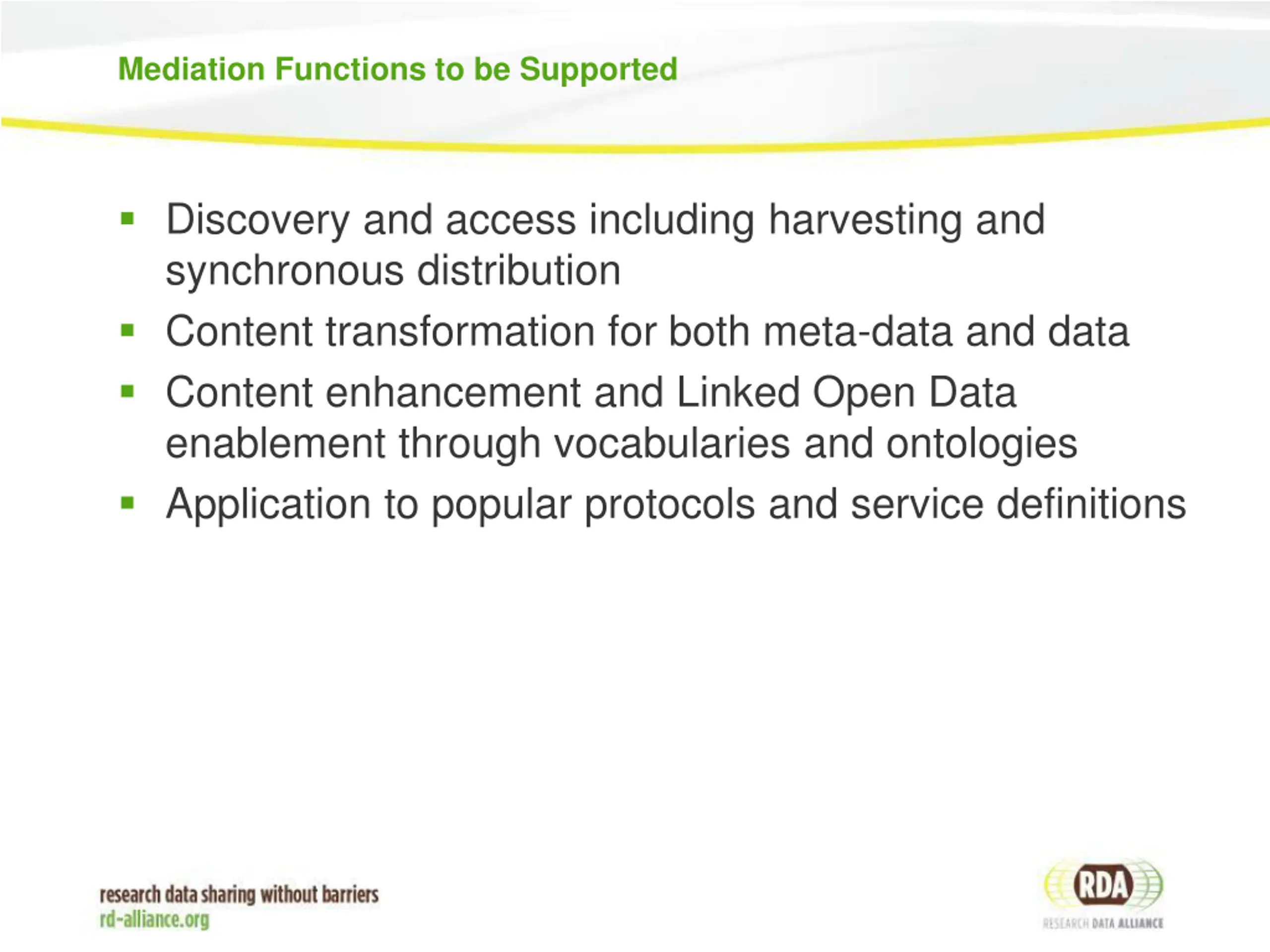 Mediation Functions to be Supported Discovery and access including harvesting and synchronous distribution Content transformation for both meta-data and data Content enhancement and Linked Open Data enablement through vocabularies and ontologies Application to popular protocols and service definitions
