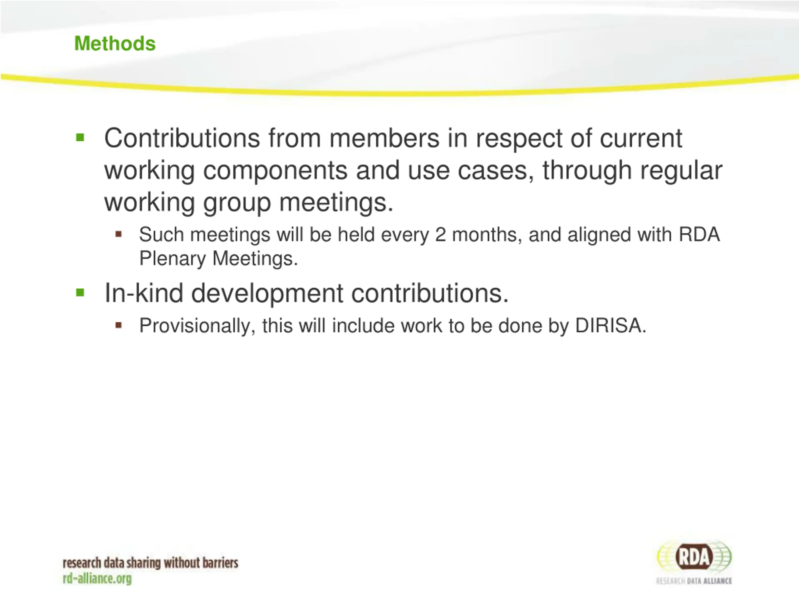 Methods Contributions from members in respect of current working components and use cases, through regular working group meetings. Such meetings will be held every 2 months, and aligned with RDA Plenary Meetings. In-kind development contributions. Provisionally, this will include work to be done by DIRISA.