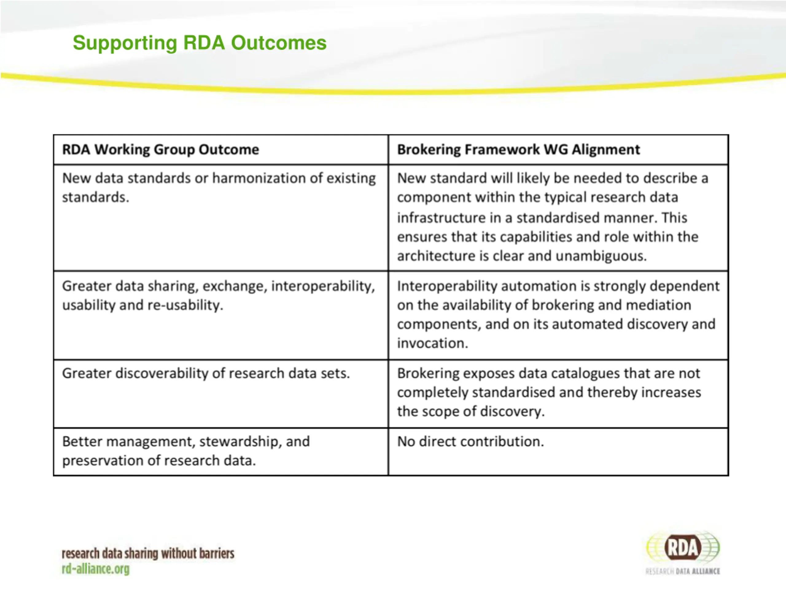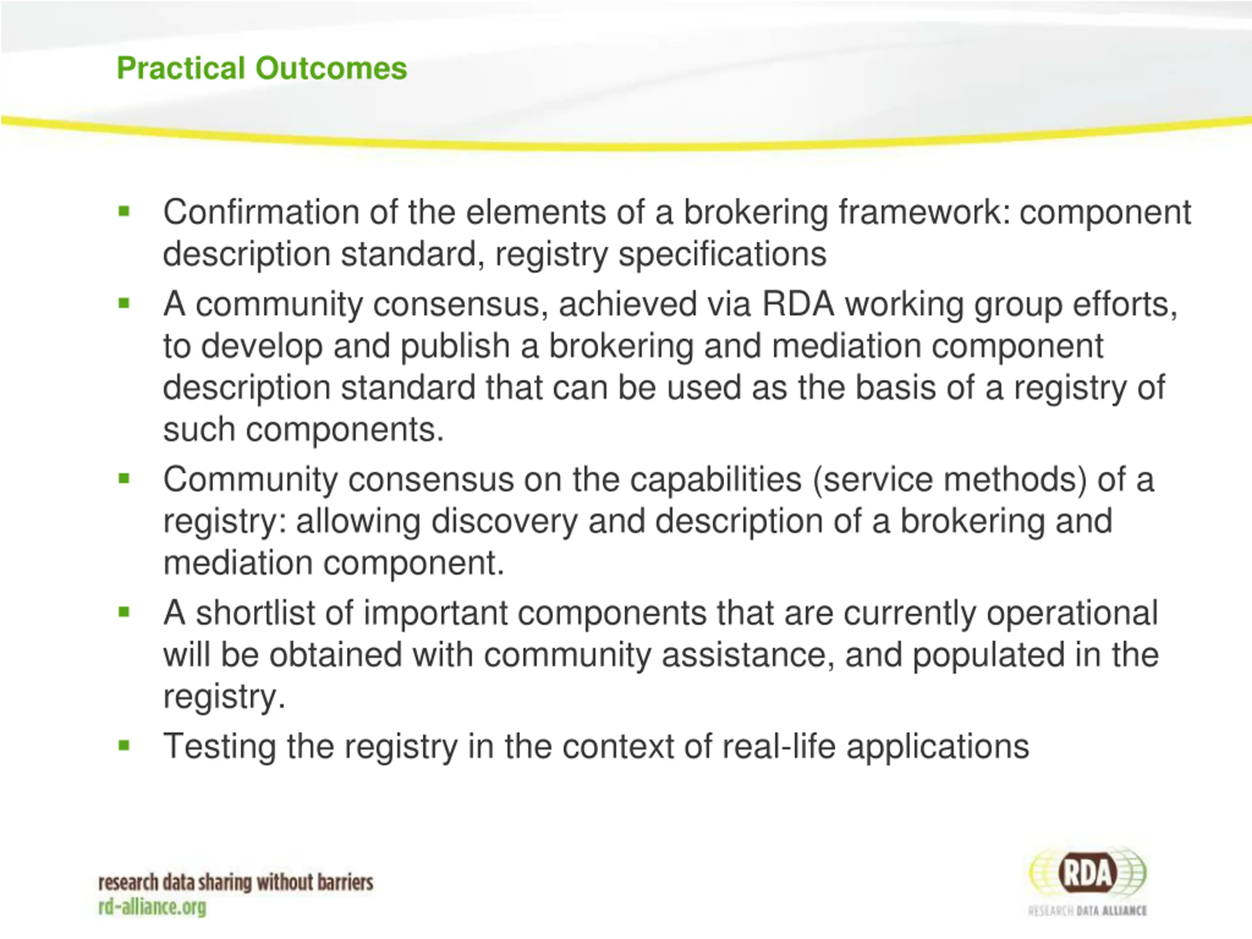 Practical Outcomes Confirmation of the elements of a brokering framework: component description standard, registry specifications A community consensus, achieved via RDA working group efforts, to develop and publish a brokering and mediation component description standard that can be used as the basis of a registry of such components. Community consensus on the capabilities (service methods) of a registry: allowing discovery and description of a brokering and mediation component. A shortlist of important components that are currently operational will be obtained with community assistance, and populated in the registry. Testing the registry in the context of real-life applications
