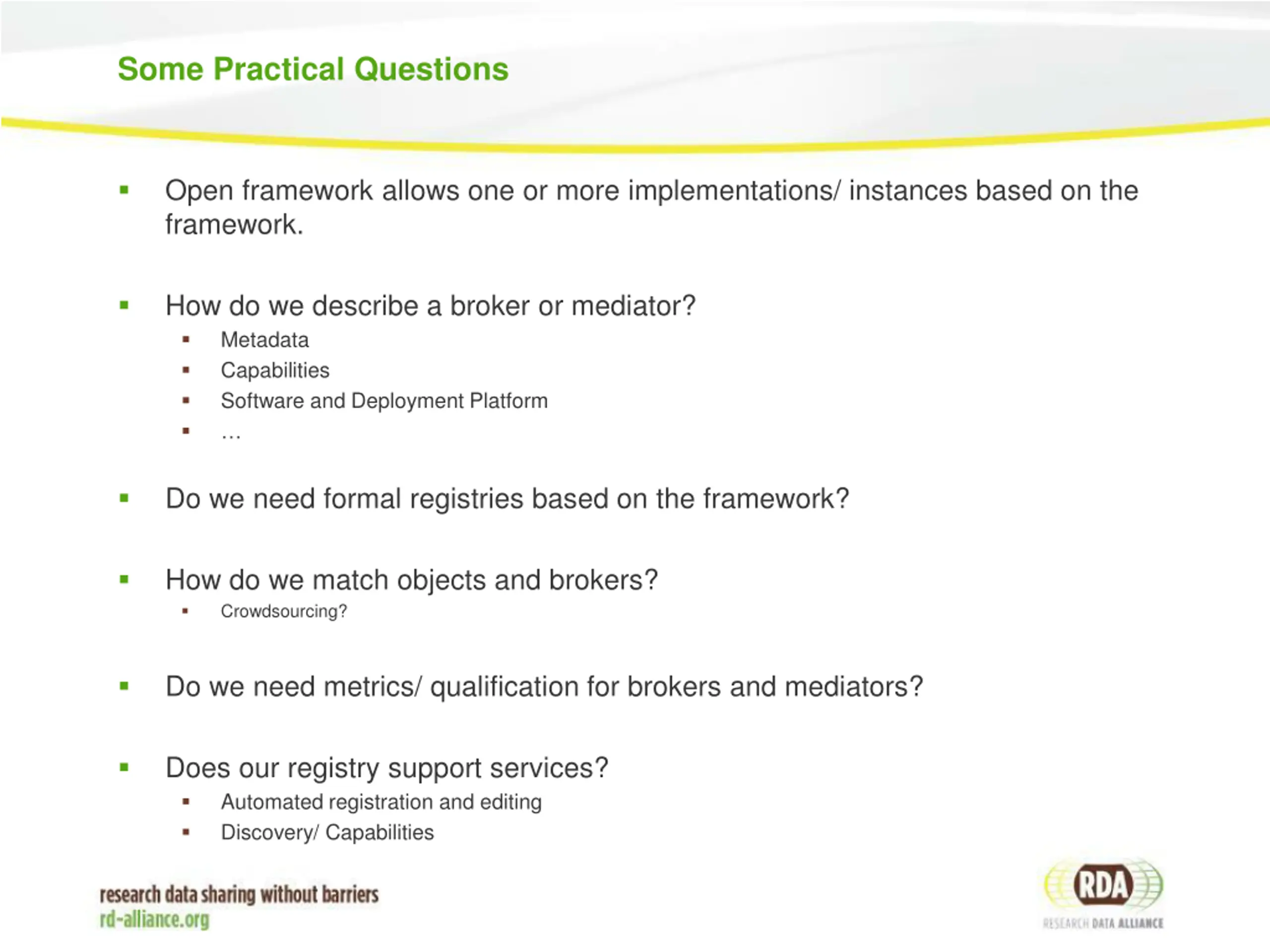 Some Practical Questions Open framework allows one or more implementations/ instances based on the framework. How do we describe a broker or mediator? Metadata Capabilities Software and Deployment Platform Do we need formal registries based on the framework? How do we match objects and brokers? Crowdsourcing? Do we need metrics/ qualification for brokers and mediators? Does our registry support services? Automated registration and editing Discovery/ Capabilities