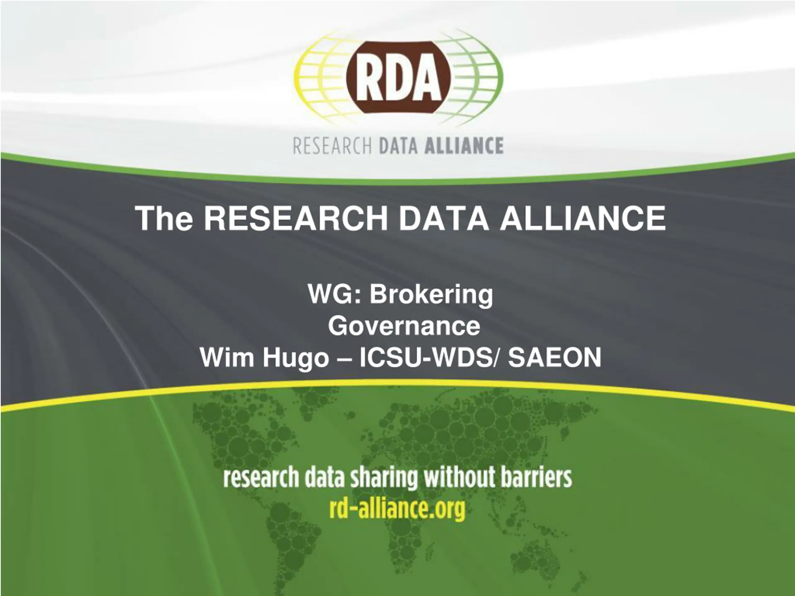 The RESEARCH DATA ALLIANCE WG: Brokering Governance Wim Hugo ICSU-WDS/ SAEON