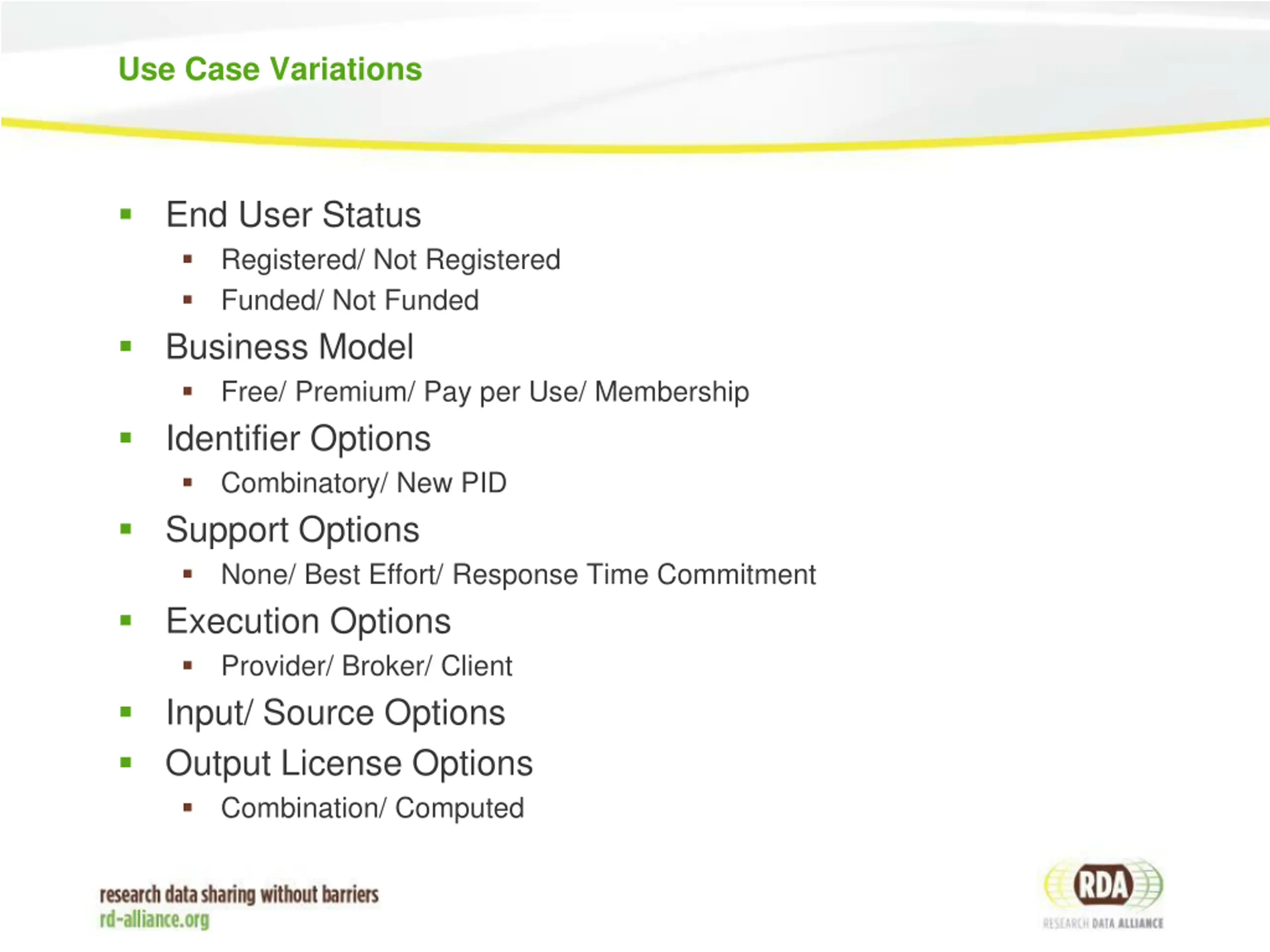 Use Case Variations End User Status Registered/ Not Registered Funded/ Not Funded Business Model Free/ Premium/ Pay per Use/ Membership Identifier Options Combinatory/ New PID Support Options None/ Best Effort/ Response Time Commitment Execution Options Provider/ Broker/ Client Input/ Source Options Output License Options Combination/ Computed