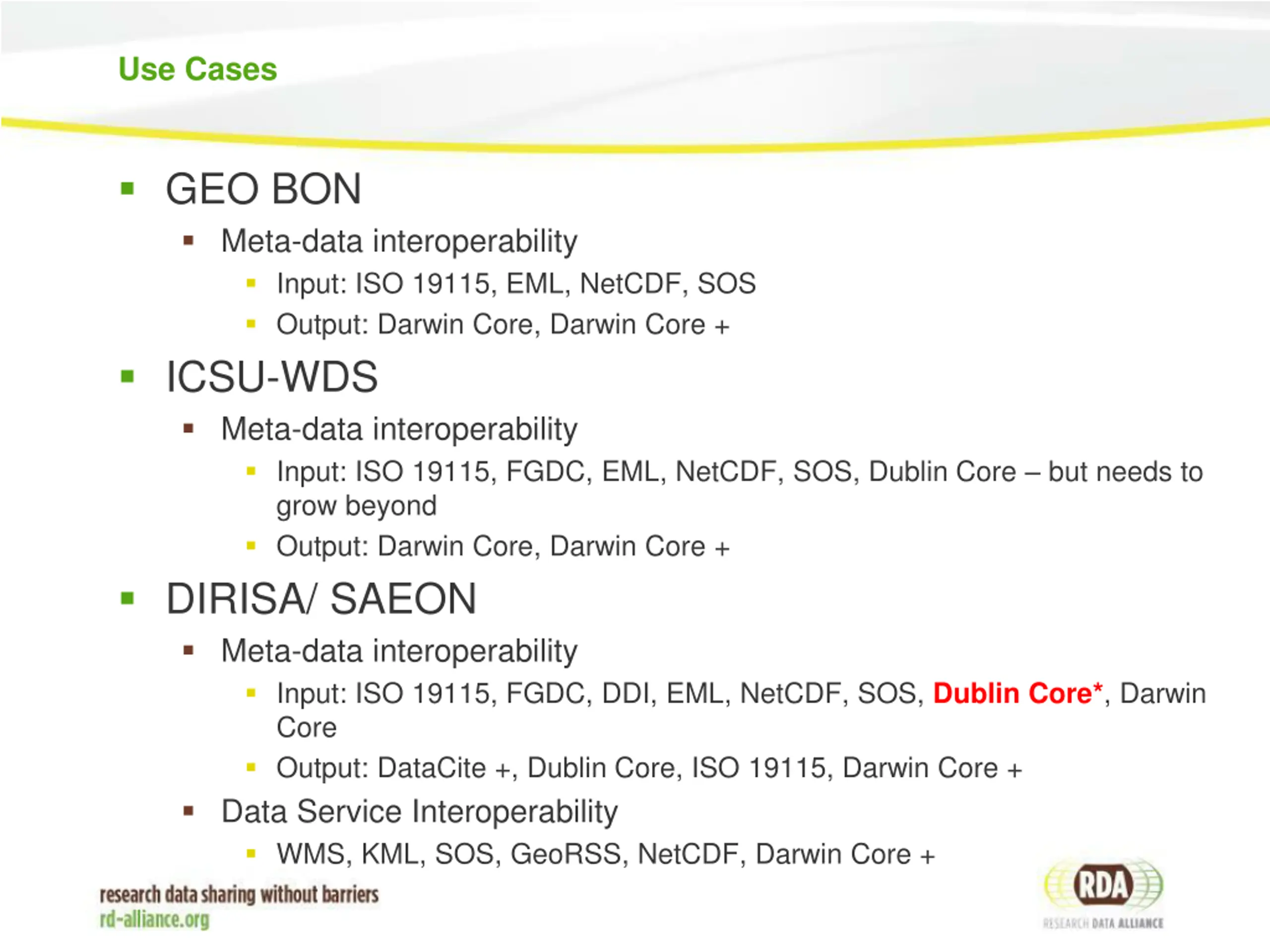 Use Cases GEO BON Meta-data interoperability Input: ISO 19115, EML, NetCDF, SOS Output: Darwin Core, Darwin Core + ICSU-WDS Meta-data interoperability Input: ISO 19115, FGDC, EML, NetCDF, SOS, Dublin Core but needs to grow beyond Output: Darwin Core, Darwin Core + DIRISA/ SAEON Meta-data interoperability Input: ISO 19115, FGDC, DDI, EML, NetCDF, SOS, Dublin Core*, Darwin Core Output: DataCite +, Dublin Core, ISO 19115, Darwin Core + Data Service Interoperability WMS, KML, SOS, GeoRSS, NetCDF, Darwin Core +