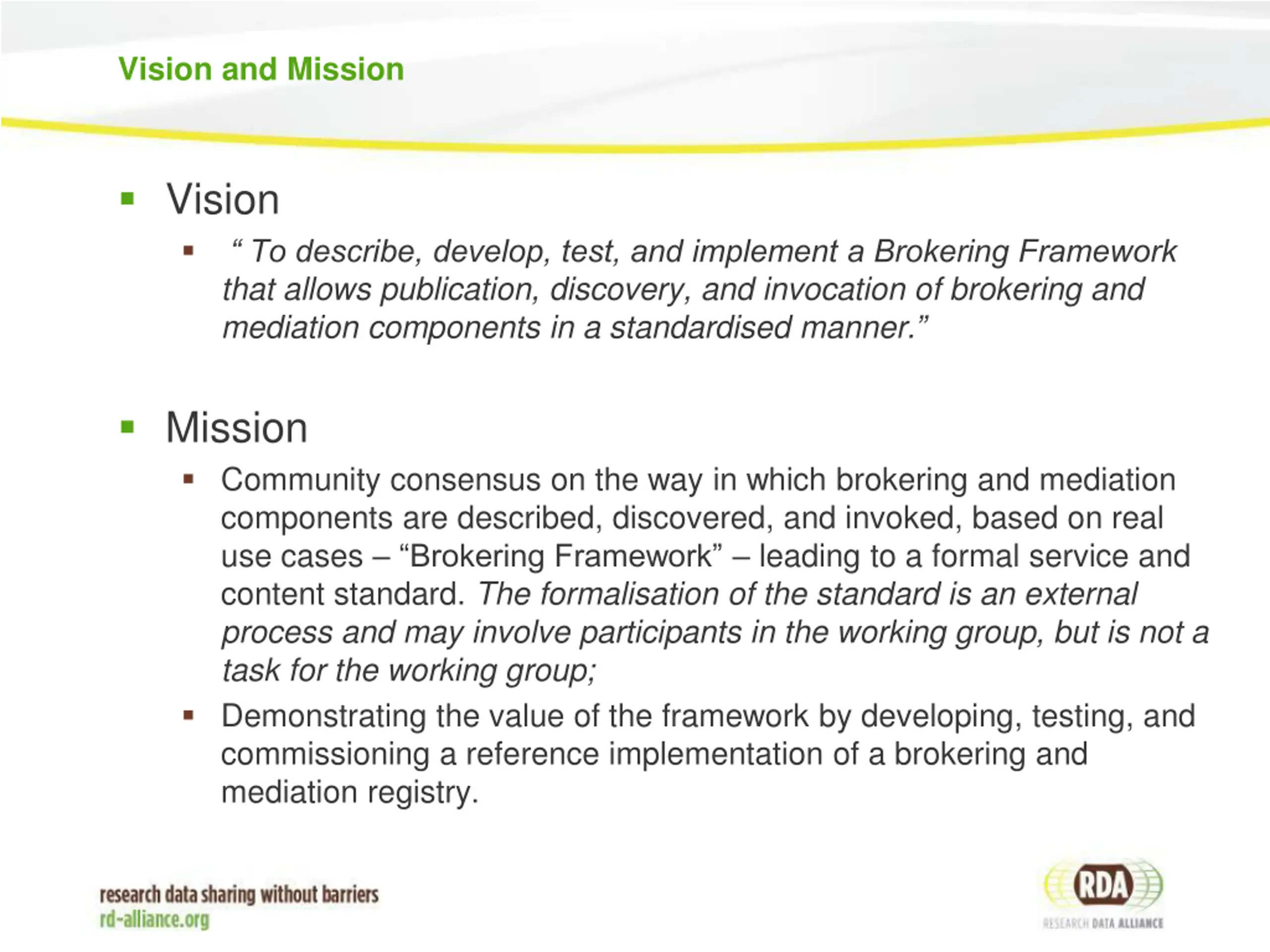 Vision and Mission Vision To describe, develop, test, and implement a Brokering Framework that allows publication, discovery, and invocation of brokering and mediation components in a standardised manner. Mission Community consensus on the way in which brokering and mediation components are described, discovered, and invoked, based on real use cases Brokering Framework leading to a formal service and content standard. The formalisation of the standard is an external process and may involve participants in the working group, but is not a task for the working group; Demonstrating the value of the framework by developing, testing, and commissioning a reference implementation of a brokering and mediation registry.