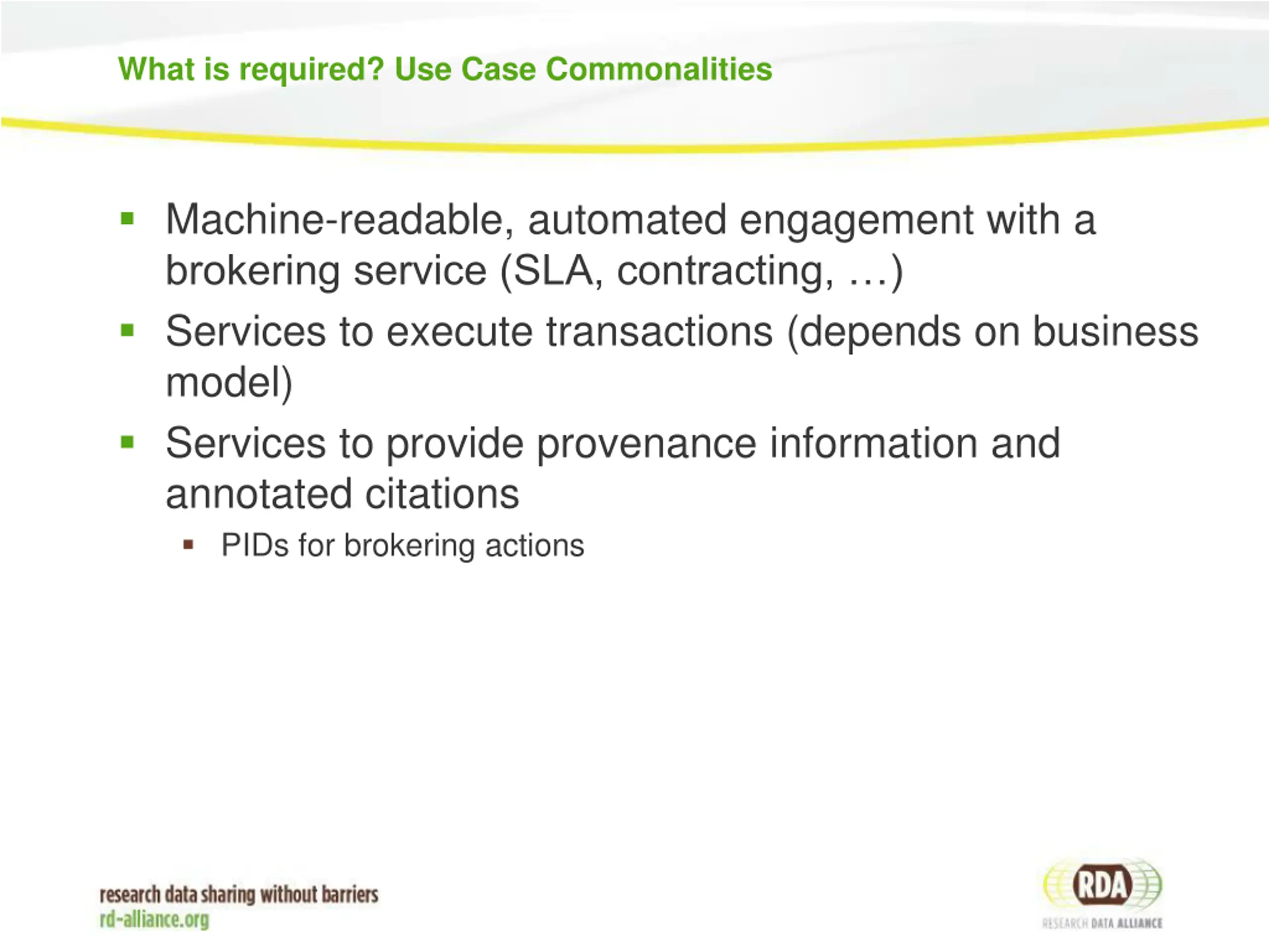 What is required? Use Case Commonalities Machine-readable, automated engagement with a brokering service (SLA, contracting, ) Services to execute transactions (depends on business model) Services to provide provenance information and annotated citations PIDs for brokering actions