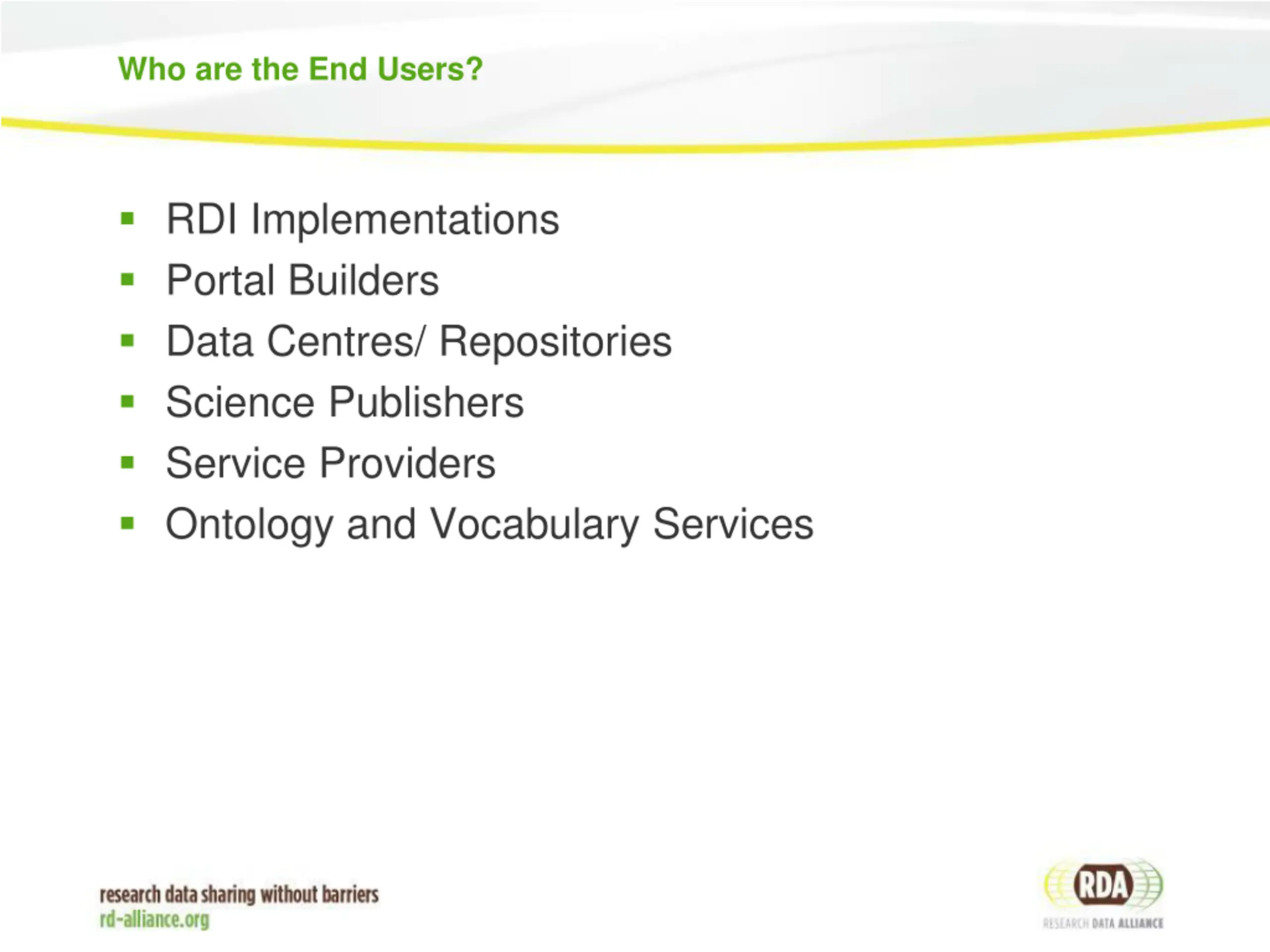 Who are the End Users? RDI Implementations Portal Builders Data Centres/ Repositories Science Publishers Service Providers Ontology and Vocabulary Services
