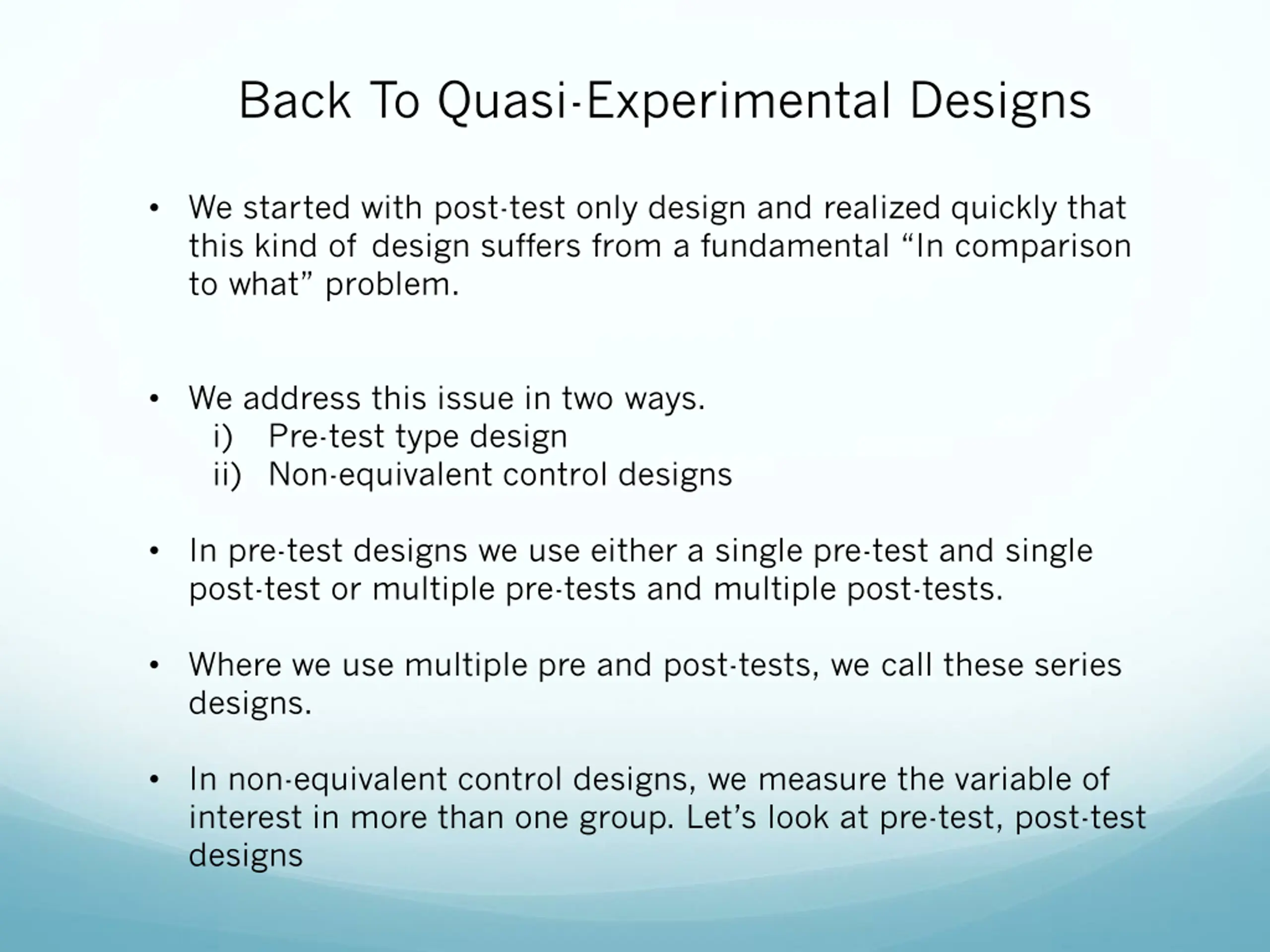 Back To Quasi-Experimental Designs We started with post-test only design and realized quickly that this kind of design suffers from a fundamental In comparison to what problem. We address this issue in two ways. i) Pre-test type design ii) Non-equivalent control designs In pre-test designs we use either a single pre-test and single post-test or multiple pre-tests and multiple post-tests. Where we use multiple pre and post-tests, we call these series designs. In non-equivalent control designs, we measure the variable of interest in more than one group. Let s look at pre-test, post-test designs