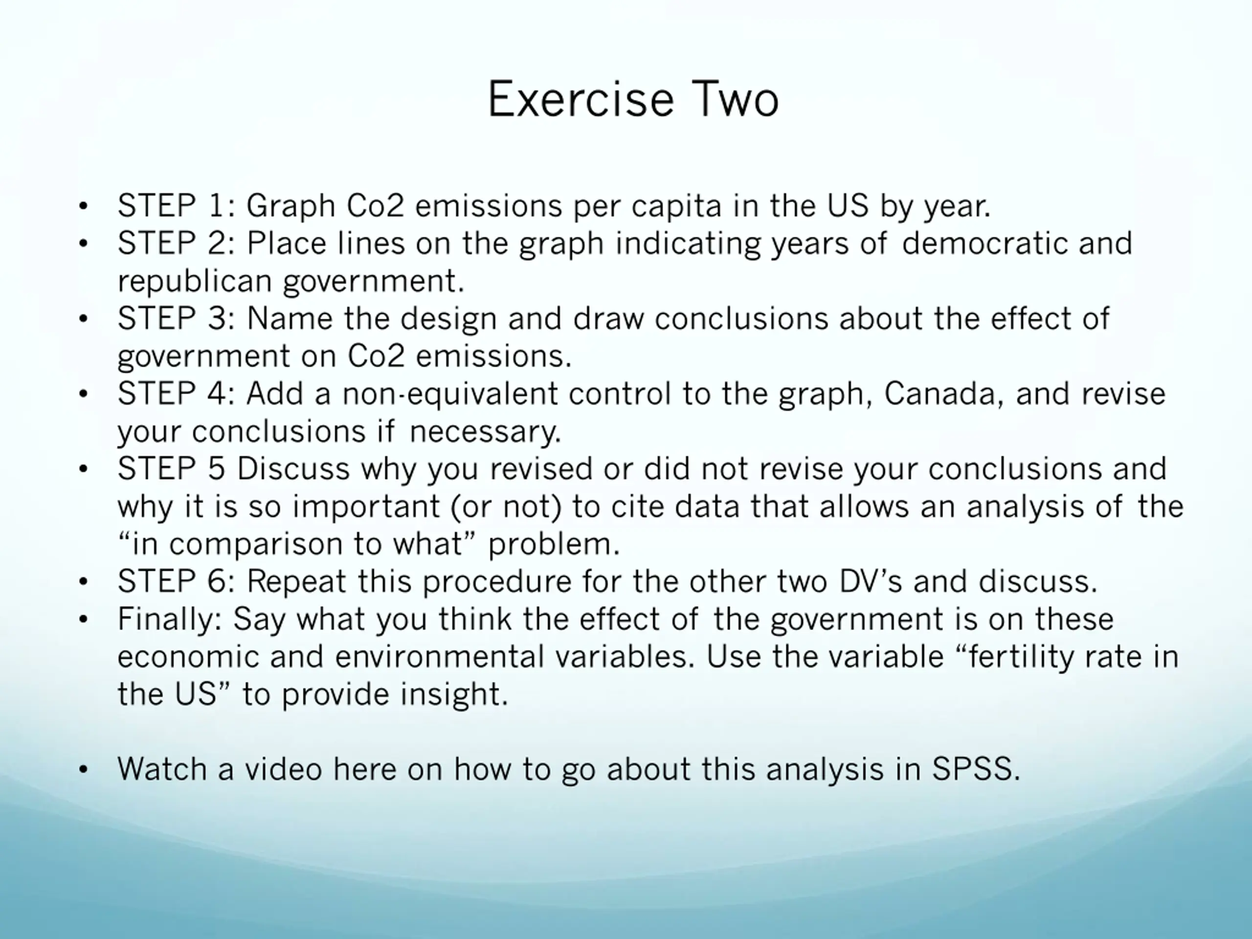 Exercise Two STEP 1: Graph Co2 emissions per capita in the US by year. STEP 2: Place lines on the graph indicating years of democratic and republican government. STEP 3: Name the design and draw conclusions about the effect of government on Co2 emissions. STEP 4: Add a non-equivalent control to the graph, Canada, and revise your conclusions if necessary. STEP 5 Discuss why you revised or did not revise your conclusions and why it is so important (or not) to cite data that allows an analysis of the in comparison to what problem. STEP 6: Repeat this procedure for the other two DV s and discuss. Finally: Say what you think the effect of the government is on these economic and environmental variables. Use the variable fertility rate in the US to provide insight. Watch a video here on how to go about this analysis in SPSS.