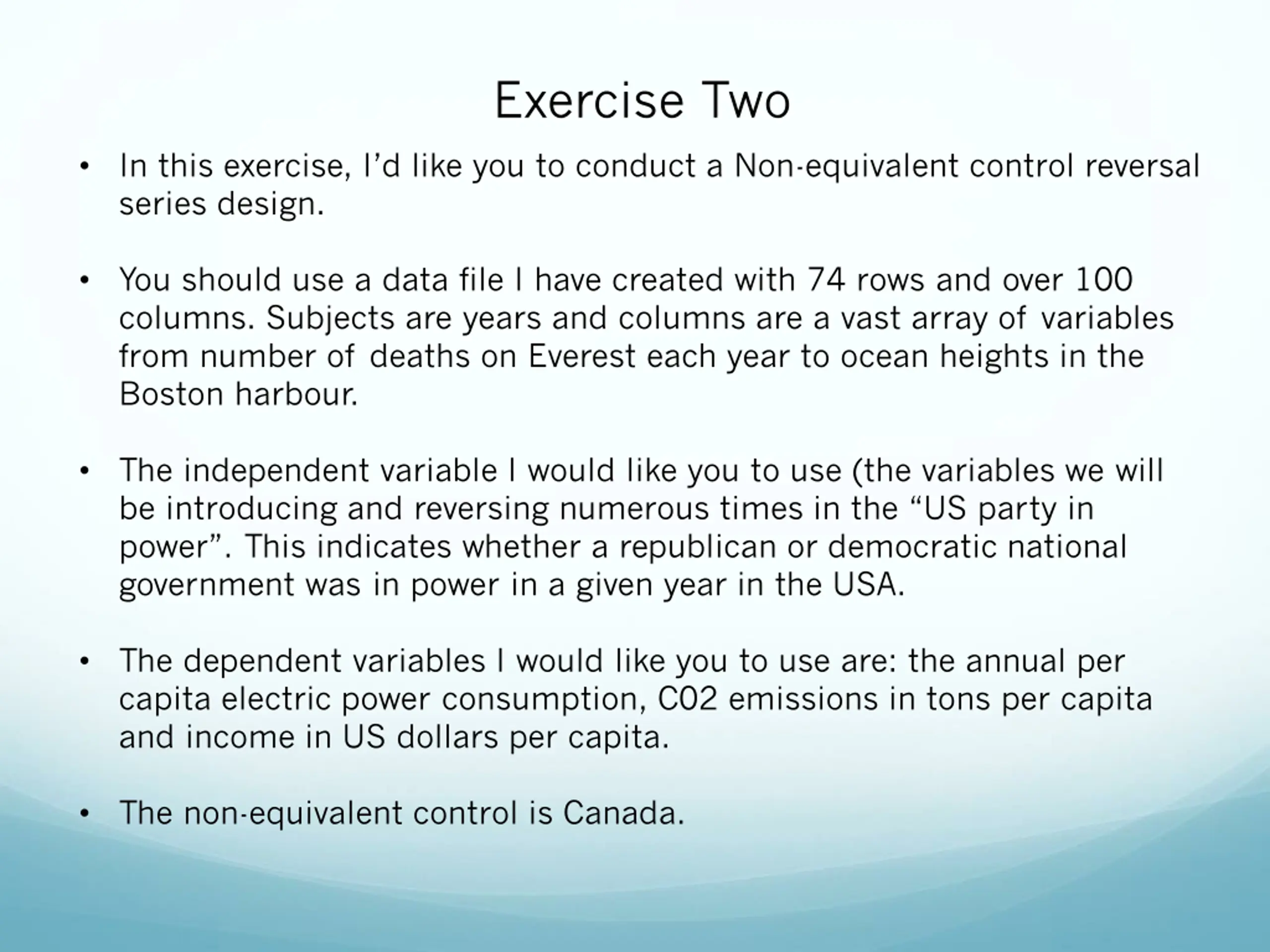 Exercise Two In this exercise, I d like you to conduct a Non-equivalent control reversal series design. You should use a data file I have created with 74 rows and over 100 columns. Subjects are years and columns are a vast array of variables from number of deaths on Everest each year to ocean heights in the Boston harbour. The independent variable I would like you to use (the variables we will be introducing and reversing numerous times in the US party in power . This indicates whether a republican or democratic national government was in power in a given year in the USA. The dependent variables I would like you to use are: the annual per capita electric power consumption, C02 emissions in tons per capita and income in US dollars per capita. The non-equivalent control is Canada.