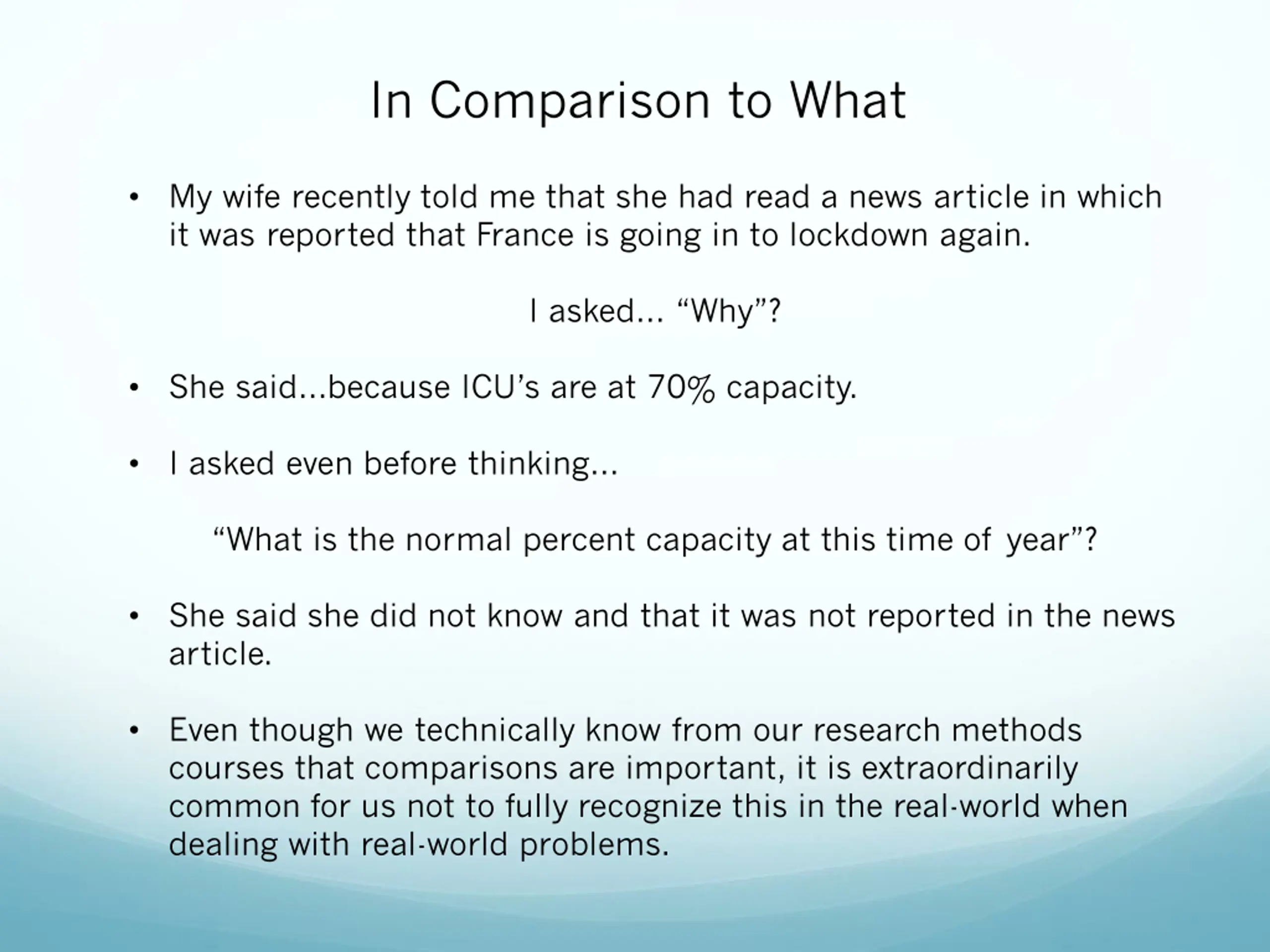 In Comparison to What My wife recently told me that she had read a news article in which it was reported that France is going in to lockdown again. I asked Why ? She said because ICU s are at 70% capacity. I asked even before thinking What is the normal percent capacity at this time of year ? She said she did not know and that it was not reported in the news article. Even though we technically know from our research methods courses that comparisons are important, it is extraordinarily common for us not to fully recognize this in the real-world when dealing with real-world problems.