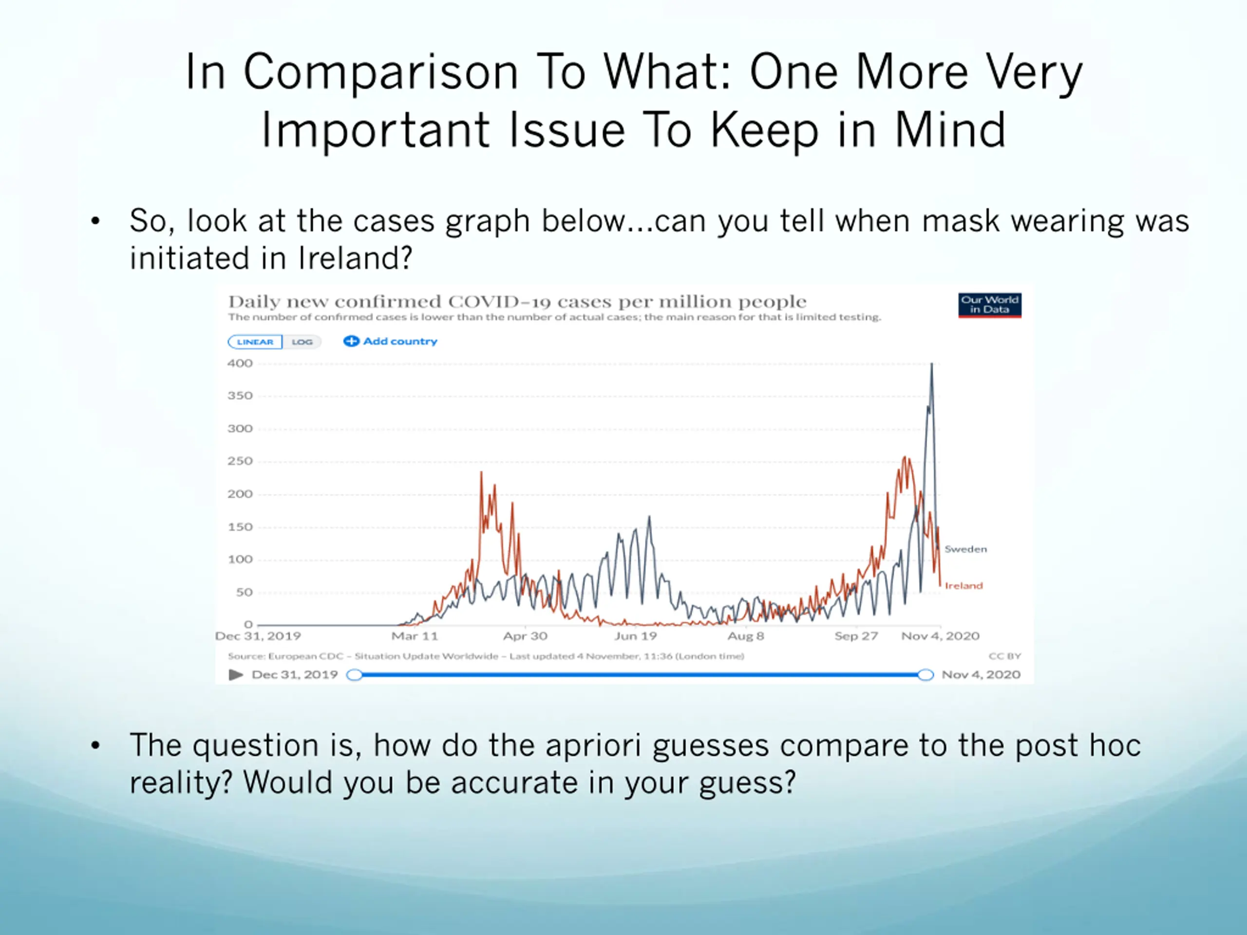 In Comparison To What: One More Very Important Issue To Keep in Mind So, look at the cases graph below can you tell when mask wearing was initiated in Ireland? The question is, how do the apriori guesses compare to the post hoc reality? Would you be accurate in your guess?
