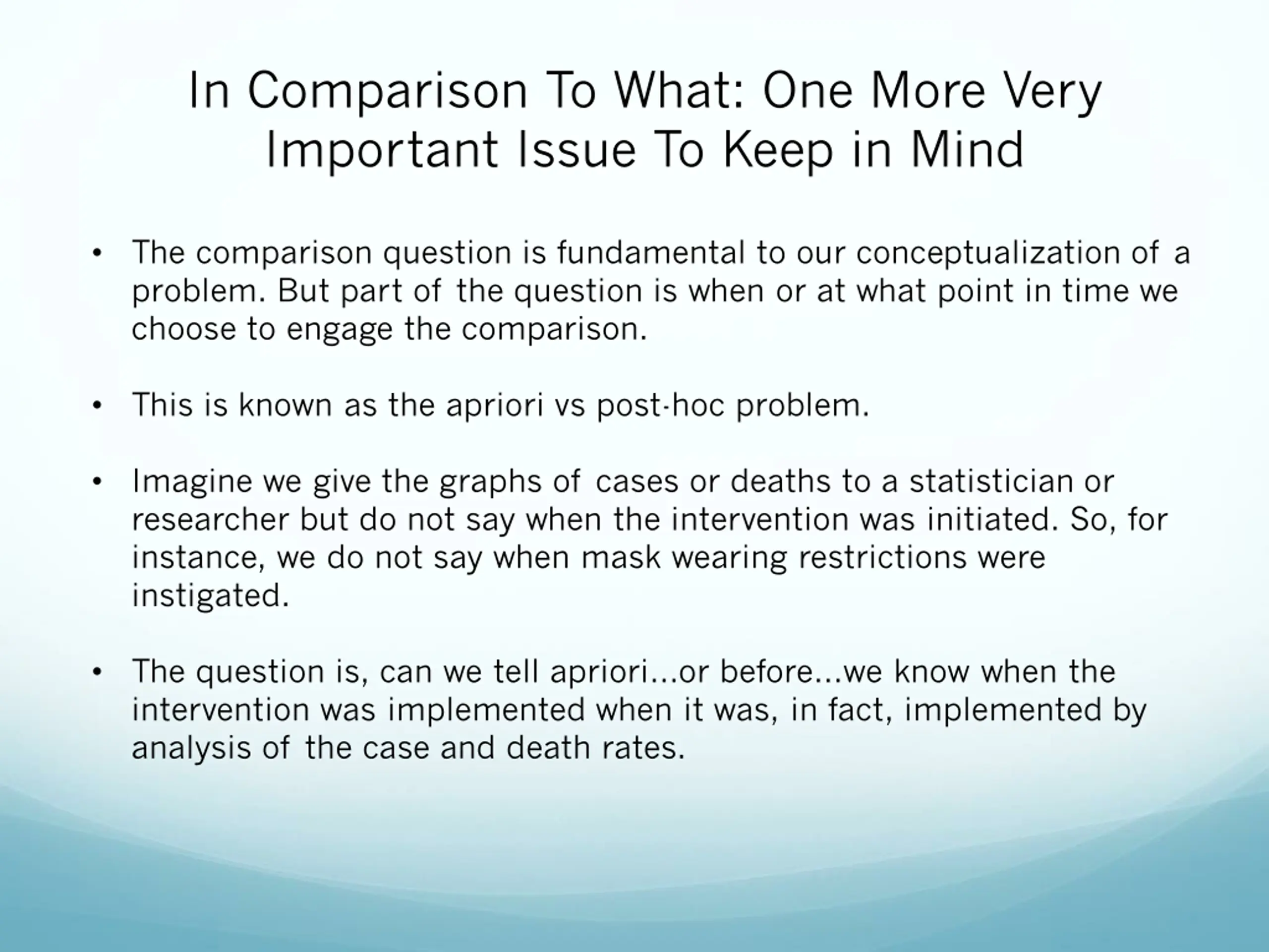 In Comparison To What: One More Very Important Issue To Keep in Mind The comparison question is fundamental to our conceptualization of a problem. But part of the question is when or at what point in time we choose to engage the comparison. This is known as the apriori vs post-hoc problem. Imagine we give the graphs of cases or deaths to a statistician or researcher but do not say when the intervention was initiated. So, for instance, we do not say when mask wearing restrictions were instigated. The question is, can we tell apriori or before we know when the intervention was implemented when it was, in fact, implemented by analysis of the case and death rates.