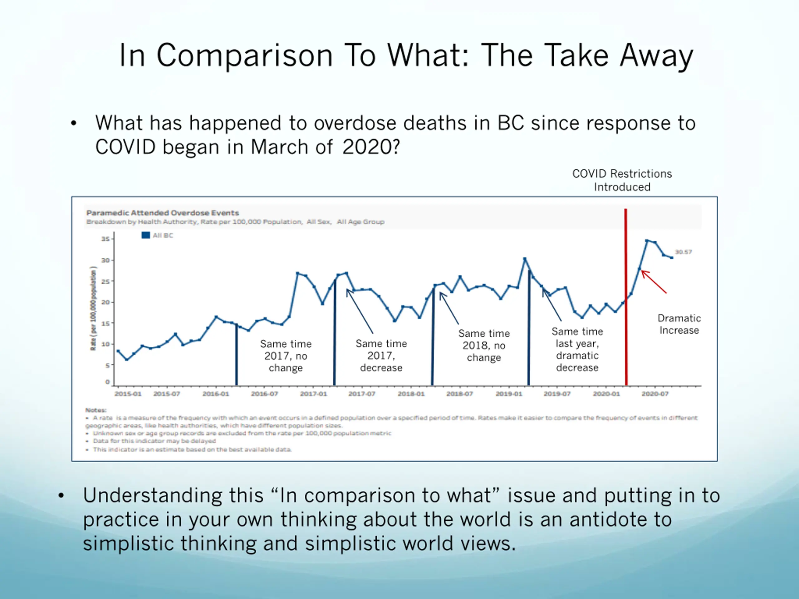 In Comparison To What: The Take Away What has happened to overdose deaths in BC since response to COVID began in March of 2020? COVID Restrictions Introduced Dramatic Increase Same time last year, dramatic decrease Same time 2018, no change Same time 2017, decrease Same time 2017, no change Understanding this In comparison to what issue and putting in to practice in your own thinking about the world is an antidote to simplistic thinking and simplistic world views.
