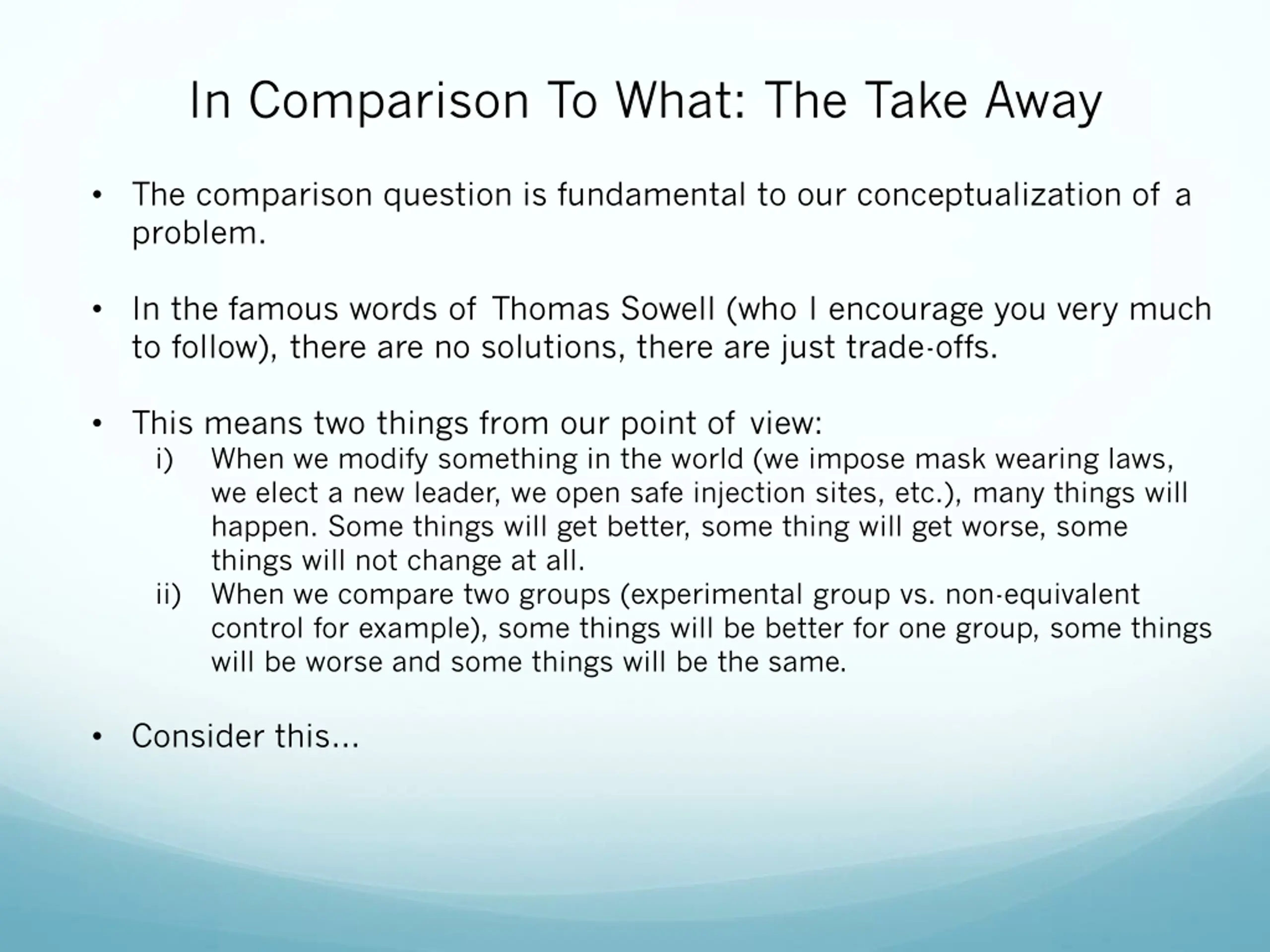 In Comparison To What: The Take Away The comparison question is fundamental to our conceptualization of a problem. In the famous words of Thomas Sowell (who I encourage you very much to follow), there are no solutions, there are just trade-offs. This means two things from our point of view: i) When we modify something in the world (we impose mask wearing laws, we elect a new leader, we open safe injection sites, etc.), many things will happen. Some things will get better, some thing will get worse, some things will not change at all. ii) When we compare two groups (experimental group vs. non-equivalent control for example), some things will be better for one group, some things will be worse and some things will be the same. Consider this