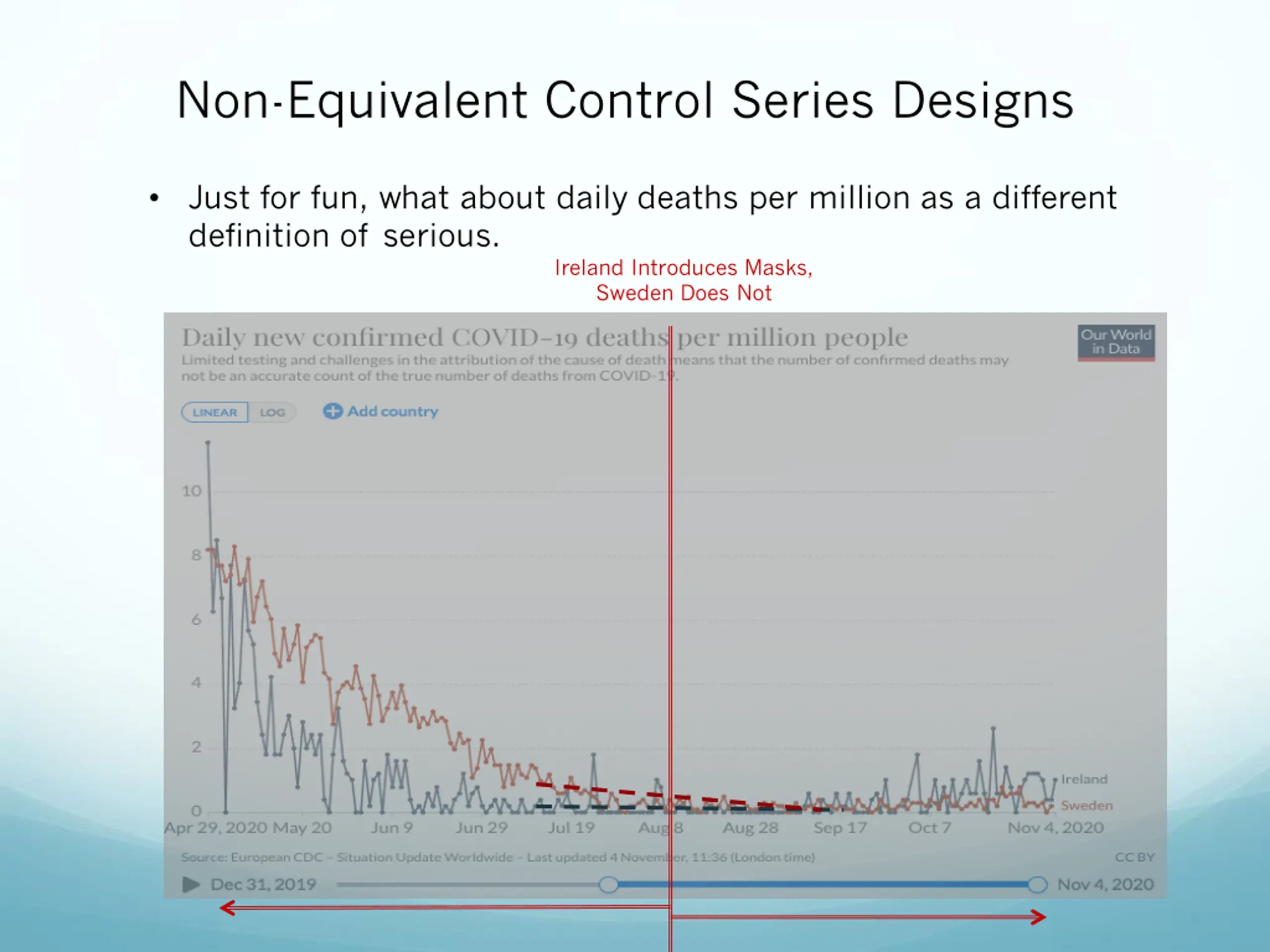 Non-Equivalent Control Series Designs Just for fun, what about daily deaths per million as a different definition of serious. Ireland Introduces Masks, Sweden Does Not