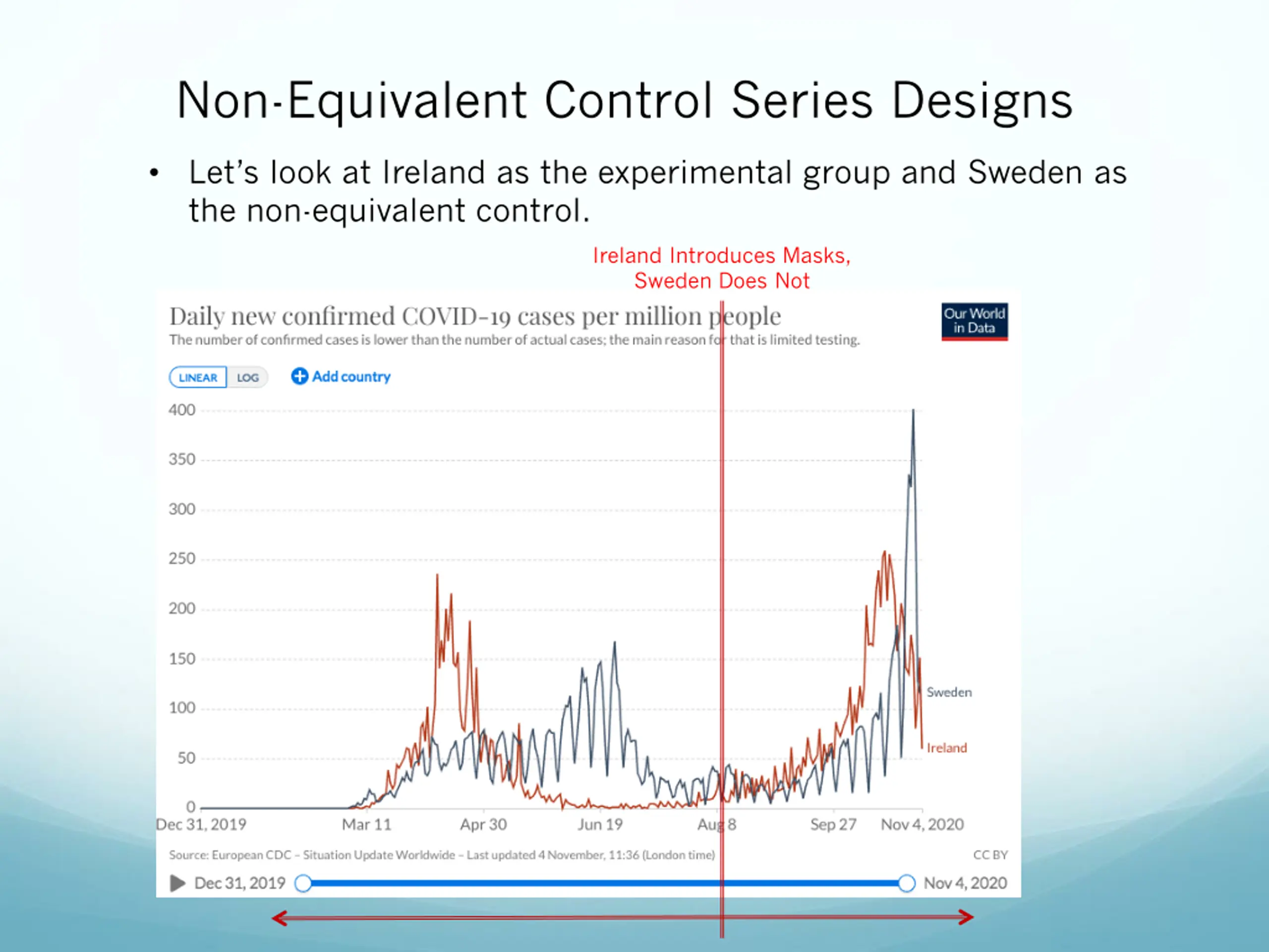 Non-Equivalent Control Series Designs Let s look at Ireland as the experimental group and Sweden as the non-equivalent control. Ireland Introduces Masks, Sweden Does Not