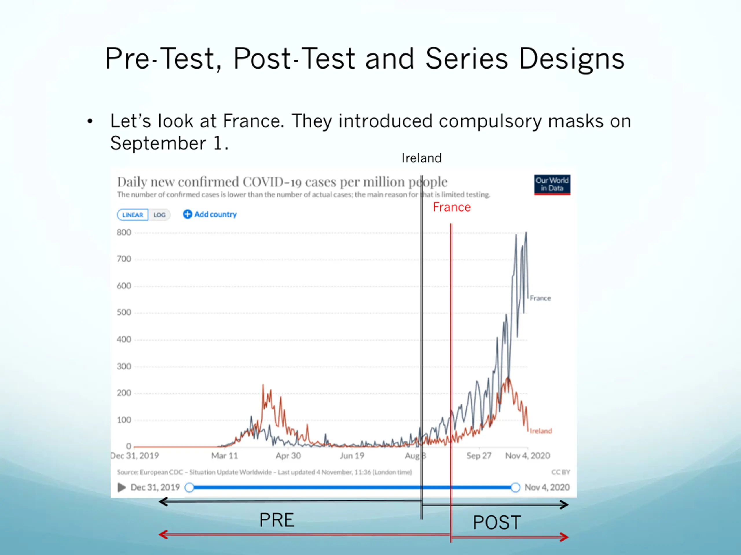 Pre-Test, Post-Test and Series Designs Let s look at France. They introduced compulsory masks on September 1. Ireland France PRE POST