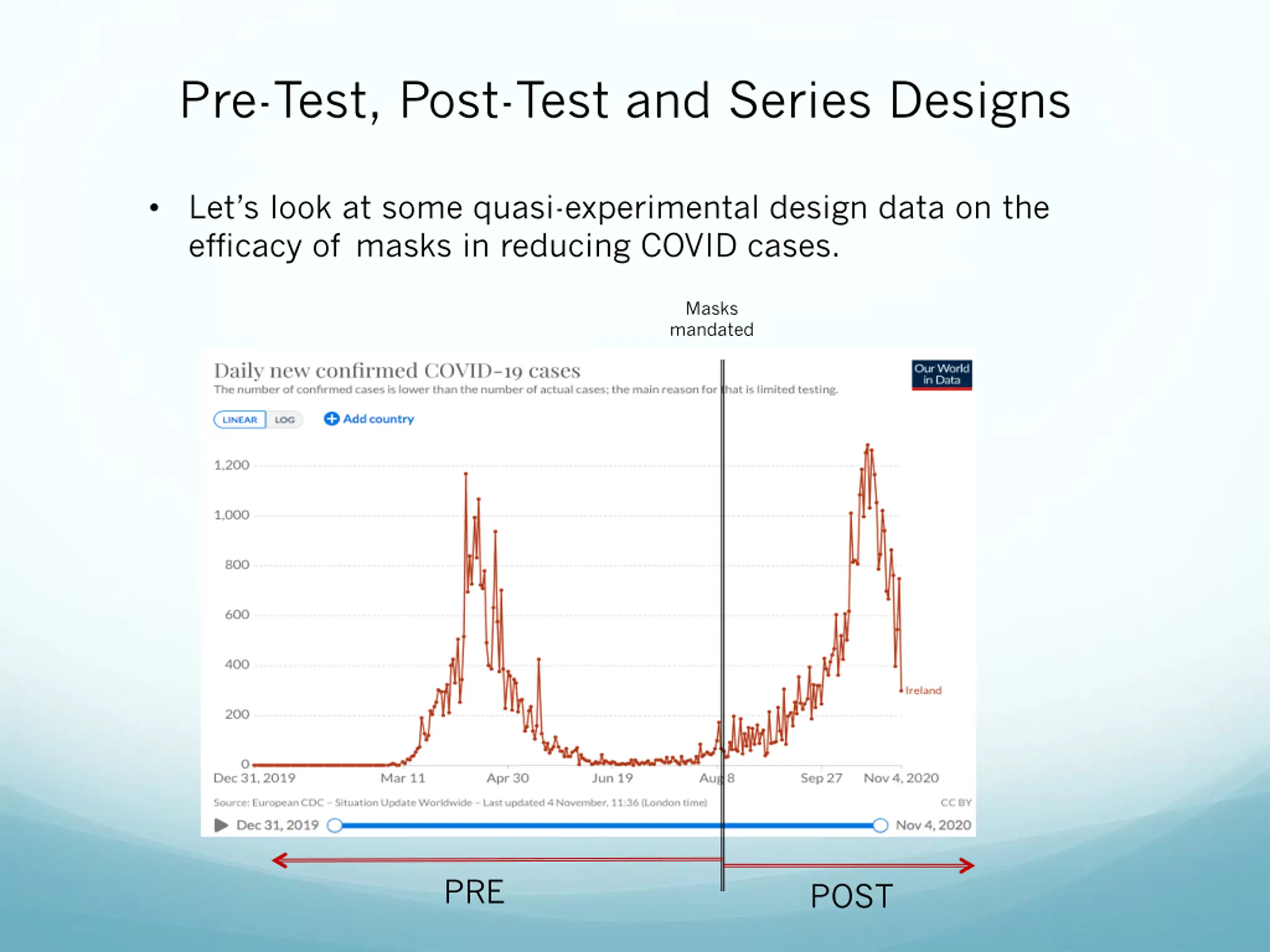 Pre-Test, Post-Test and Series Designs Let s look at some quasi-experimental design data on the efficacy of masks in reducing COVID cases. Masks mandated PRE POST