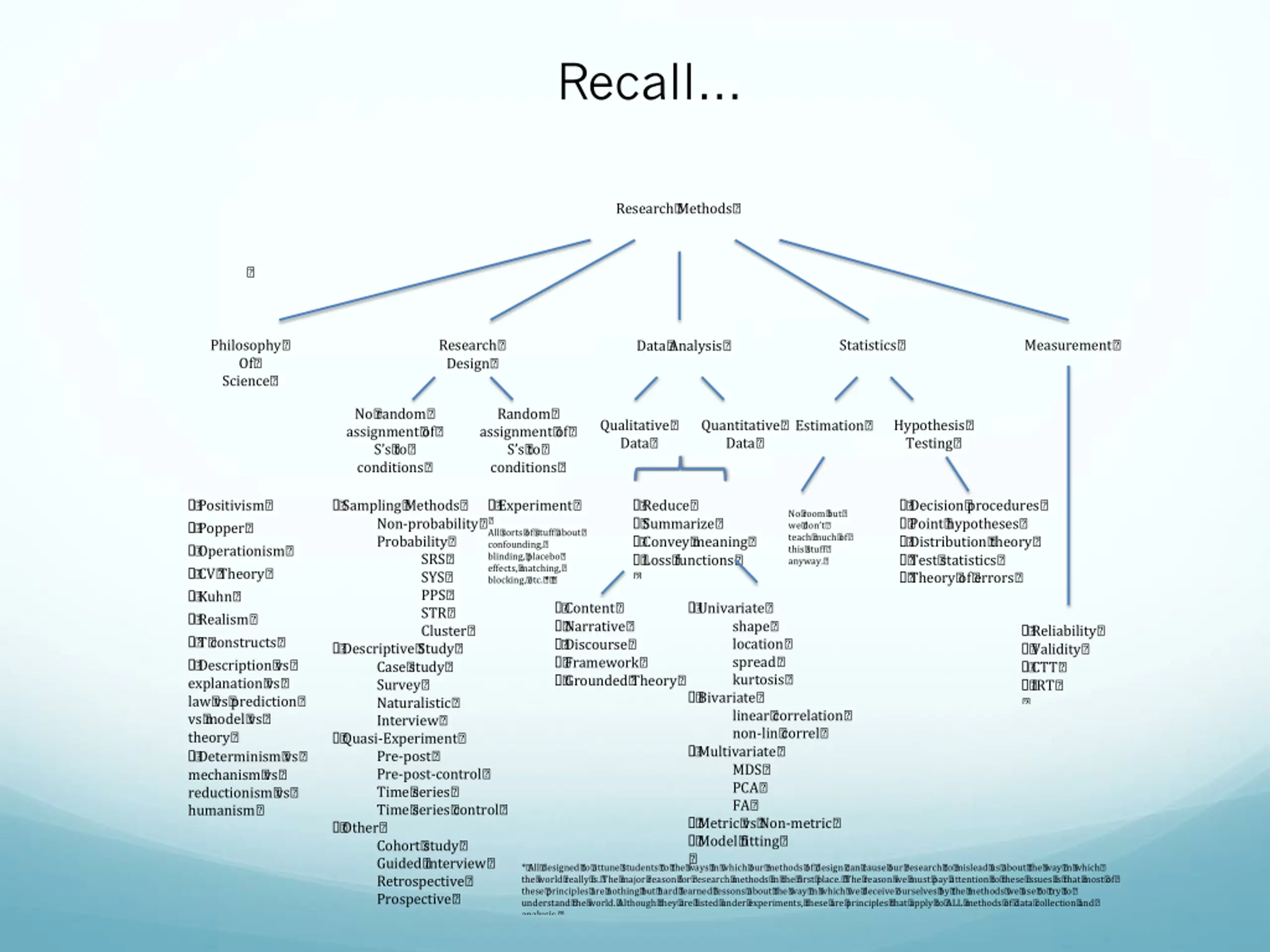 Recall Research? Methods? ? Philosophy? Of? Science? Research? Design? Statistics? Measurement? Data? Analysis? No? random? assignment? of? S s? to? conditions? Random? assignment? of? S s? to? conditions? Qualitative? Data? Quantitative? Data? Hypothesis? Testing? Estimation? ? Positivism? ? Popper? ? Sampling? Methods? Non-probability? Probability? ? Experiment? ? All? sorts? of? stuff? about? confounding,? blinding,? placebo? effects,? matching,? blocking,? etc.? *? ? ? Reduce? ? Summarize? ? Convey? meaning? ? Loss? functions? ? ? Decision? procedures? ? Point? hypotheses? ? Distribution? theory? ? Test? statistics? ? Theory? of? errors? ? No? room? but? we? don t? teach? much? of? this? stuff? anyway.? ? Operationism? ? CV? Theory? ? Kuhn? SRS? SYS? PPS? STR? Cluster? ? Content? ? Narrative? ? Discourse? ? Framework? ? Grounded? Theory? ? ? Univariate? ? Realism? ? T? constructs? ? Description? vs? explanation? vs? law? vs? prediction? vs? model? vs? theory? ? Determinism? vs? mechanism? vs? reductionism? vs? humanism? shape? location? spread? kurtosis? ? Reliability? ? Validity? ? CTT? ? IRT? ? ? Descriptive? Study? Case? study? Survey? Naturalistic? Interview? ? Quasi-Experiment? Pre-post? Pre-post-control? Time? series? Time? series? control? ? Other? Cohort? study? Guided? interview? Retrospective? Prospective? ? ? Bivariate? linear? correlation? non-lin? correl? ? Multivariate? MDS? PCA? FA? ? Metric? vs? Non-metric? ? Model? fitting? ? *? All? designed? to? attune? students? to? the? ways? in? which? our? methods? of? design? can? cause? our? research? to? mislead? us? about? the? way? in? which? the? world? really? is.? The? major? reason? for? research? methods? in? the? first? place.? ? The? reason? we? must? pay? attention? to? these? issues? is? that? most? of? these? principles? are? nothing? but? hard? learned? lessons? about? the? way? in? which? we? deceive? ourselves? by? the? methods? we? use? to? try? to? understand? the? world.? Although? they? are? listed? under? experiments,? these? are? principles? that? apply? to? ALL? methods? of? data? collection? and? analysis.?