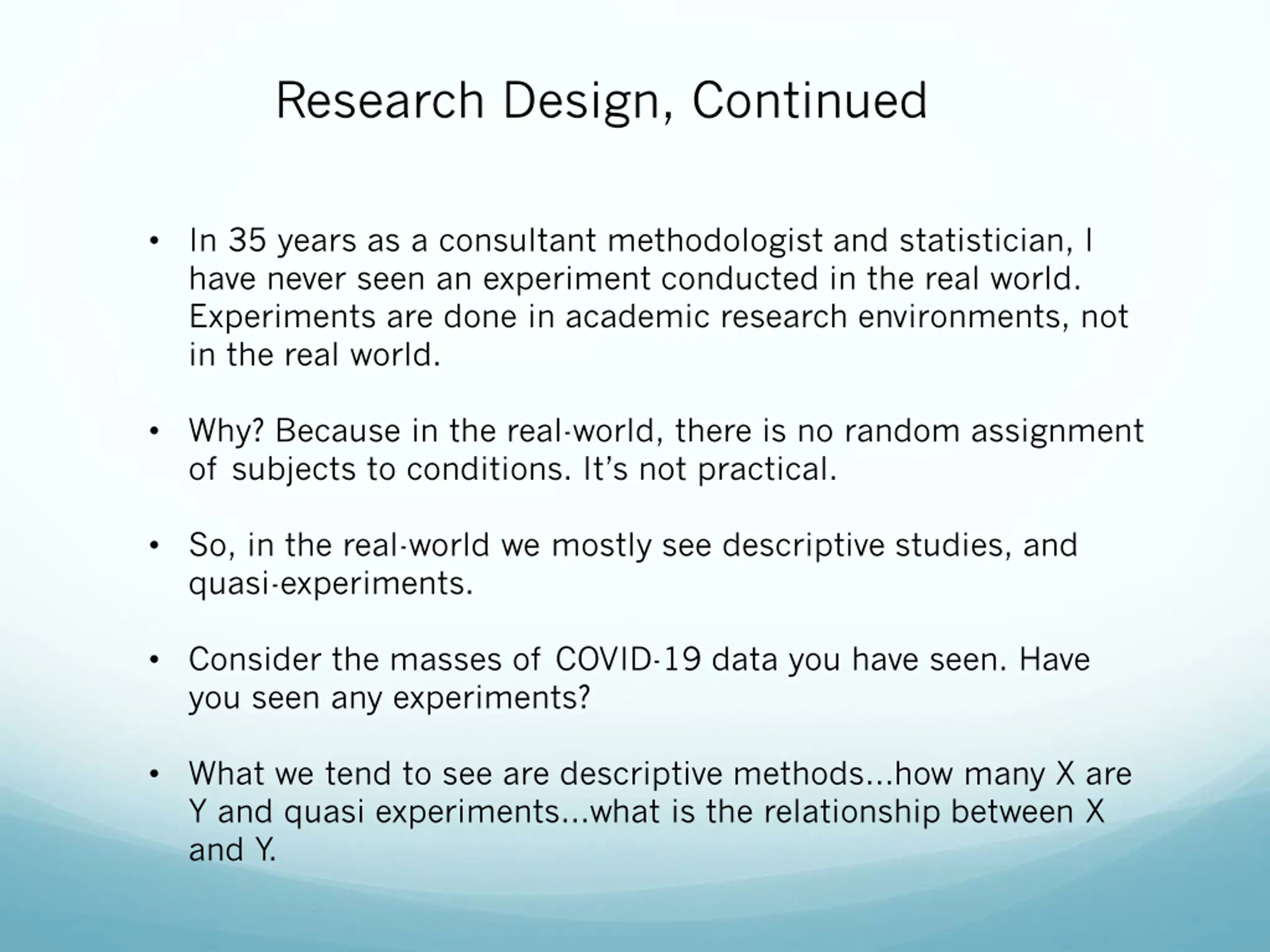 Research Design, Continued In 35 years as a consultant methodologist and statistician, I have never seen an experiment conducted in the real world. Experiments are done in academic research environments, not in the real world. Why? Because in the real-world, there is no random assignment of subjects to conditions. It s not practical. So, in the real-world we mostly see descriptive studies, and quasi-experiments. Consider the masses of COVID-19 data you have seen. Have you seen any experiments? What we tend to see are descriptive methods how many X are Y and quasi experiments what is the relationship between X and Y.