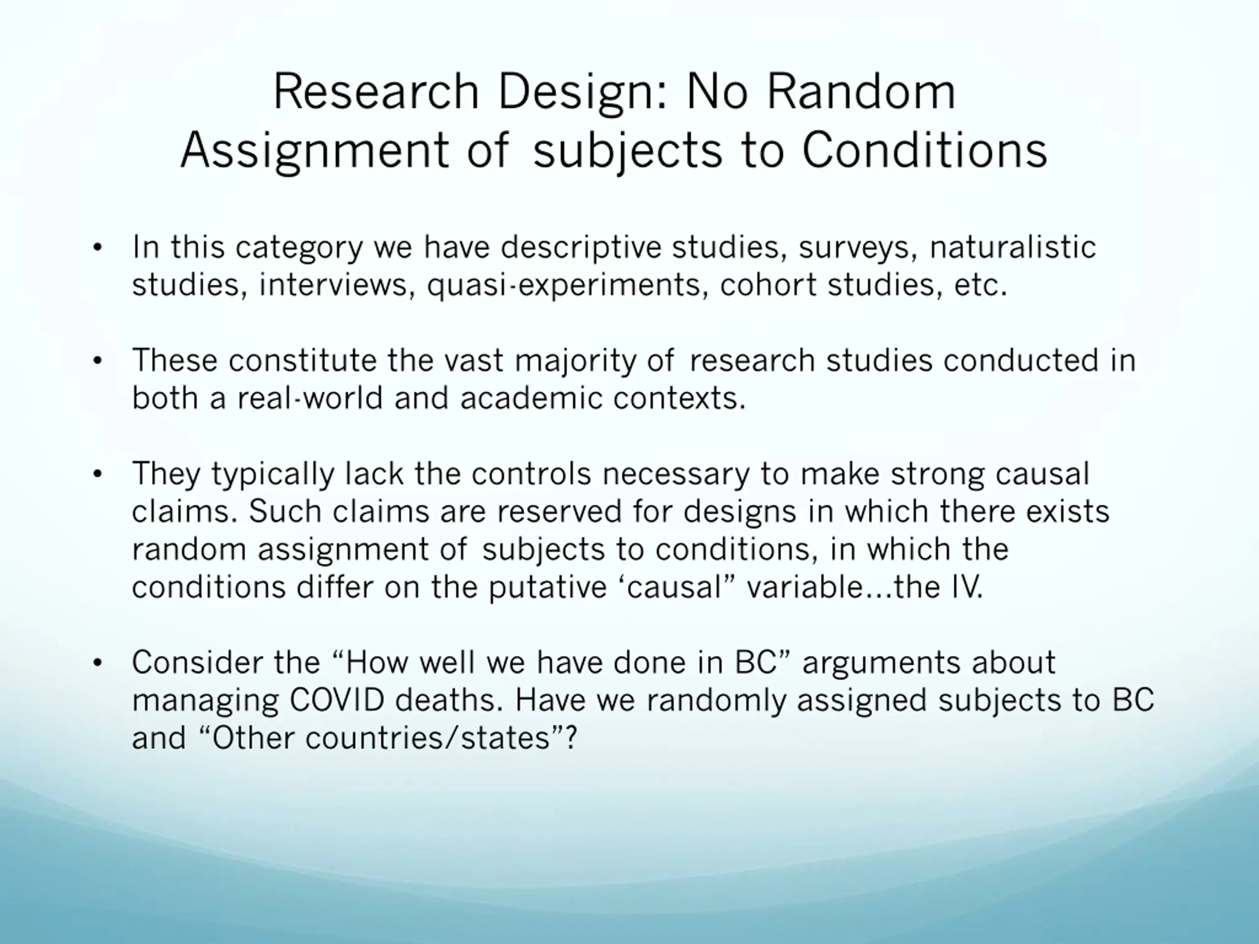 Research Design: No Random Assignment of subjects to Conditions In this category we have descriptive studies, surveys, naturalistic studies, interviews, quasi-experiments, cohort studies, etc. These constitute the vast majority of research studies conducted in both a real-world and academic contexts. They typically lack the controls necessary to make strong causal claims. Such claims are reserved for designs in which there exists random assignment of subjects to conditions, in which the conditions differ on the putative causal variable the IV. Consider the How well we have done in BC arguments about managing COVID deaths. Have we randomly assigned subjects to BC and Other countries/states ?