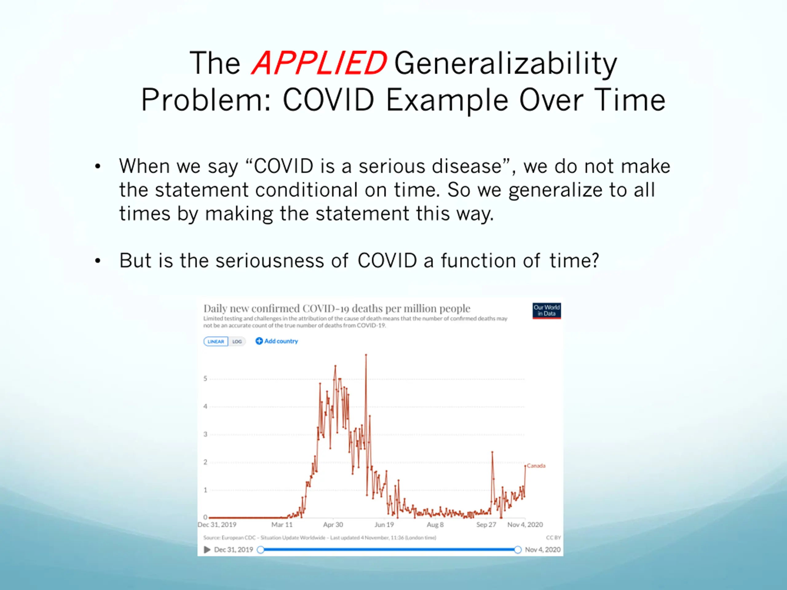 The APPLIED APPLIED Generalizability Problem: COVID Example Over Time When we say COVID is a serious disease , we do not make the statement conditional on time. So we generalize to all times by making the statement this way. But is the seriousness of COVID a function of time?