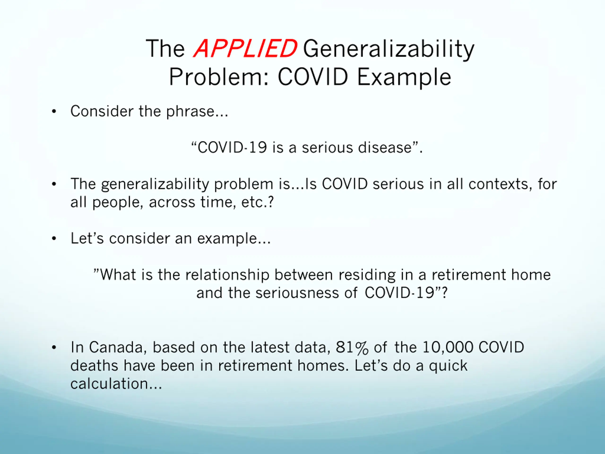 The APPLIED APPLIED Generalizability Problem: COVID Example Consider the phrase COVID-19 is a serious disease . The generalizability problem is Is COVID serious in all contexts, for all people, across time, etc.? Let s consider an example What is the relationship between residing in a retirement home and the seriousness of COVID-19 ? In Canada, based on the latest data, 81% of the 10,000 COVID deaths have been in retirement homes. Let s do a quick calculation