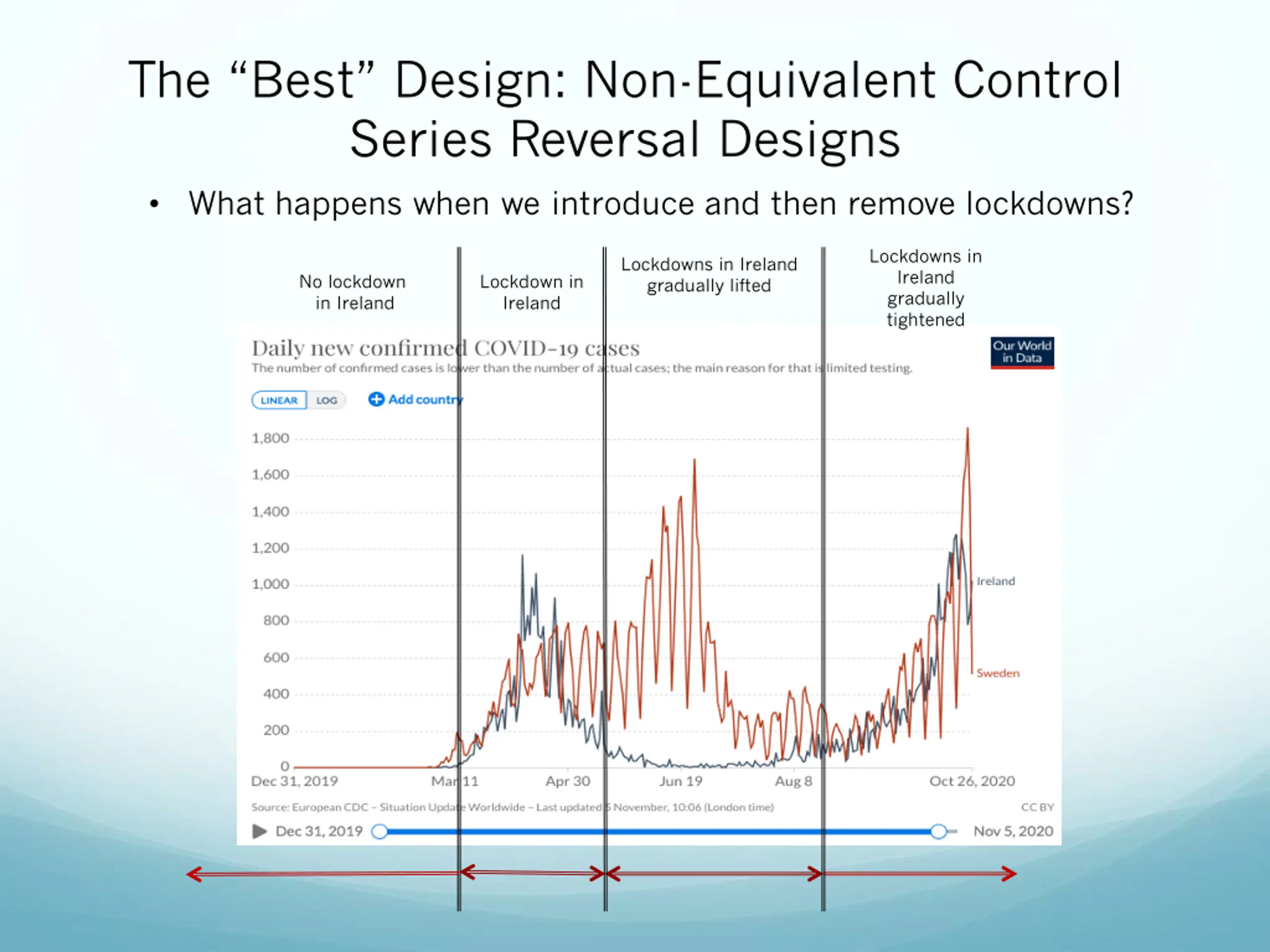The Best Design: Non-Equivalent Control Series Reversal Designs What happens when we introduce and then remove lockdowns? Lockdowns in Ireland gradually tightened Lockdowns in Ireland gradually lifted No lockdown in Ireland Lockdown in Ireland