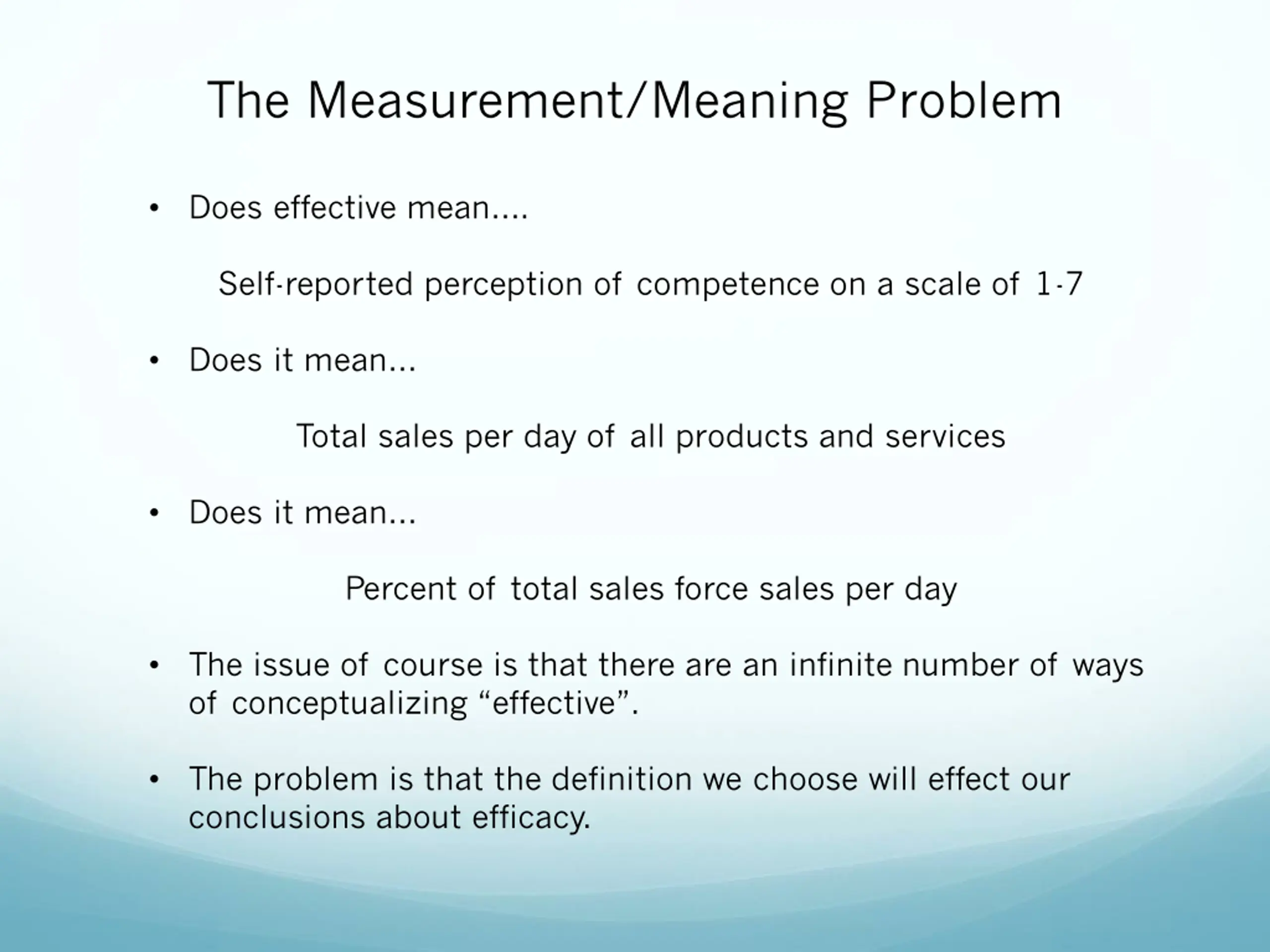 The Measurement/Meaning Problem Does effective mean . Self-reported perception of competence on a scale of 1-7 Does it mean Total sales per day of all products and services Does it mean Percent of total sales force sales per day The issue of course is that there are an infinite number of ways of conceptualizing effective . The problem is that the definition we choose will effect our conclusions about efficacy.