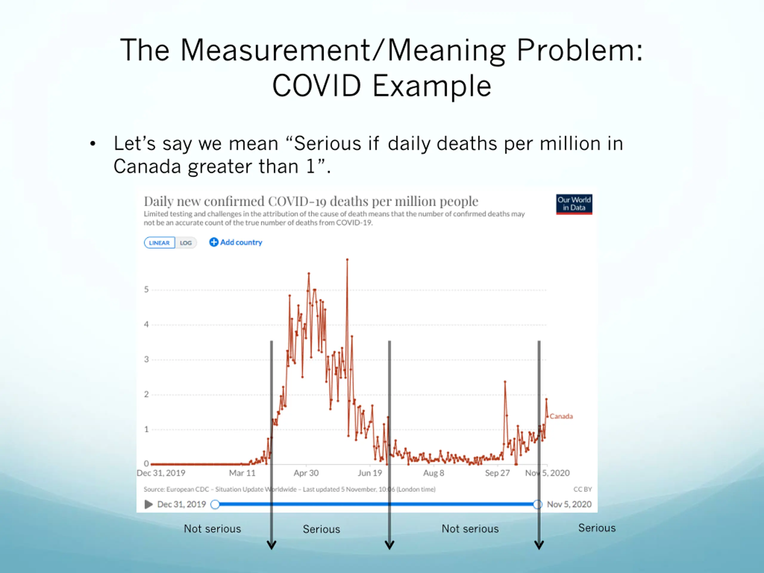 The Measurement/Meaning Problem: COVID Example But what if we mean Serious if daily deaths per million not residing in retirement homes more then 1 per million . Not serious Not serious Serious on 2 days in last 10 months