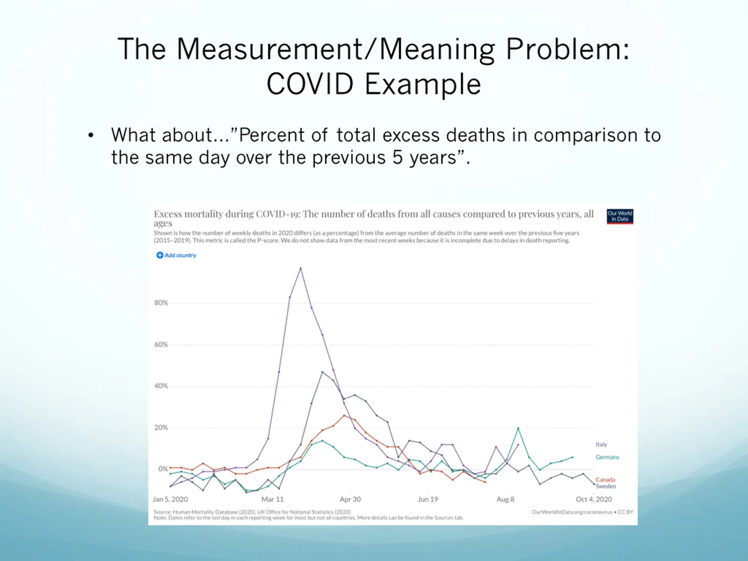 The Measurement/Meaning Problem: COVID Example What about Percent of total excess deaths in comparison to the same day over the previous 5 years .