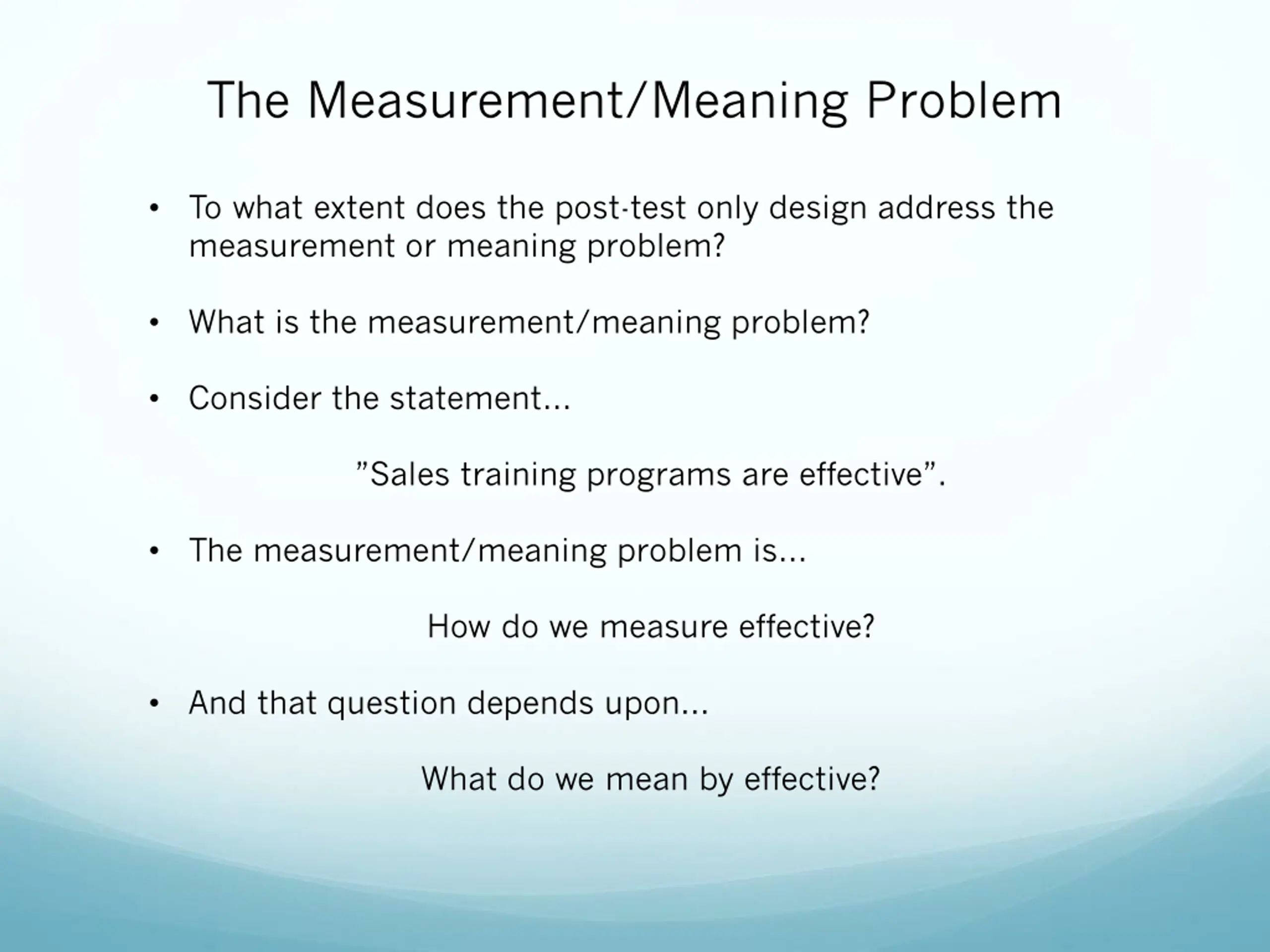 The Measurement/Meaning Problem To what extent does the post-test only design address the measurement or meaning problem? What is the measurement/meaning problem? Consider the statement Sales training programs are effective . The measurement/meaning problem is How do we measure effective? And that question depends upon What do we mean by effective?