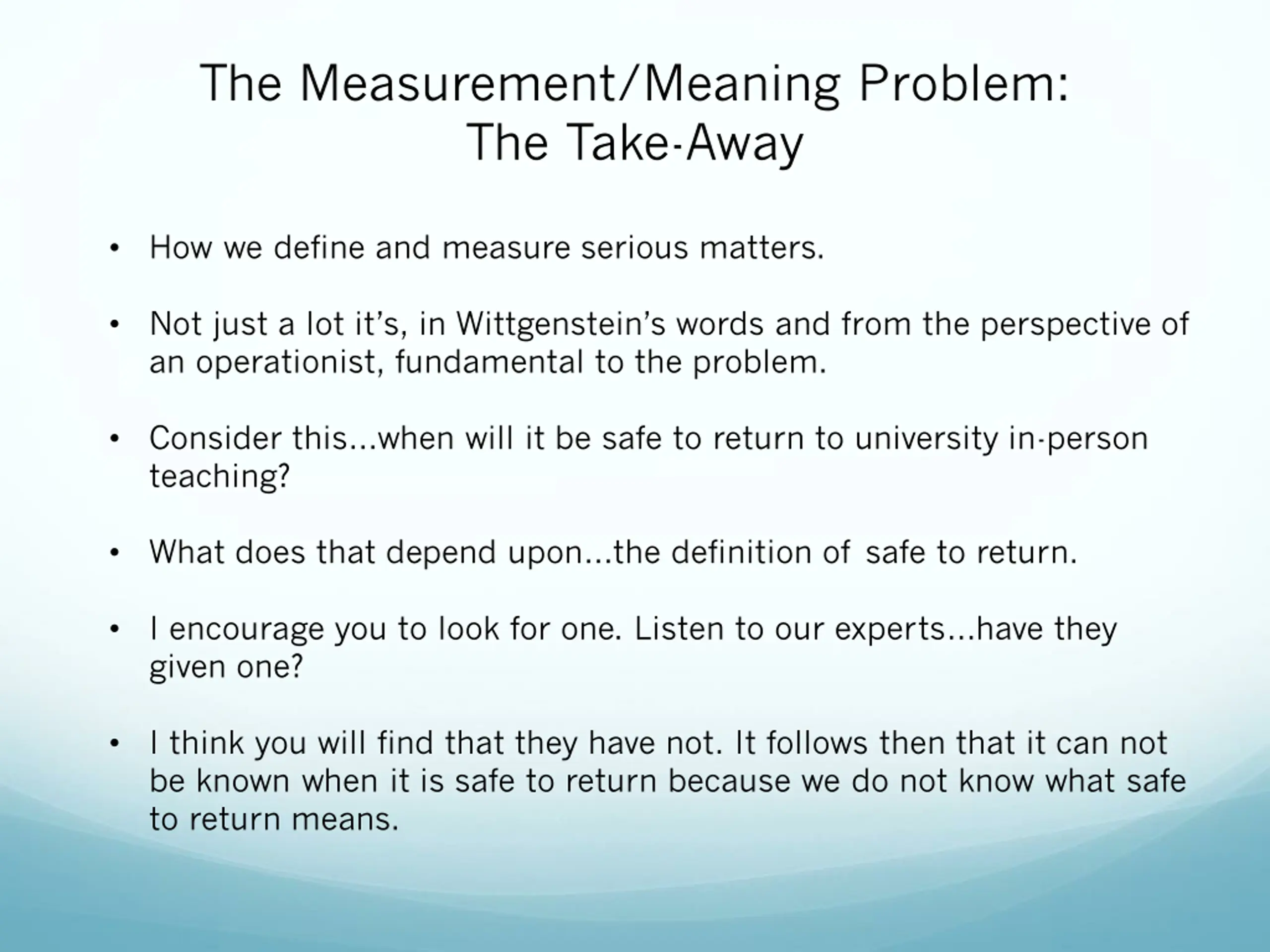 The Measurement/Meaning Problem: The Take-Away How we define and measure serious matters. Not just a lot it s, in Wittgenstein s words and from the perspective of an operationist, fundamental to the problem. Consider this when will it be safe to return to university in-person teaching? What does that depend upon the definition of safe to return. I encourage you to look for one. Listen to our experts have they given one? I think you will find that they have not. It follows then that it can not be known when it is safe to return because we do not know what safe to return means.