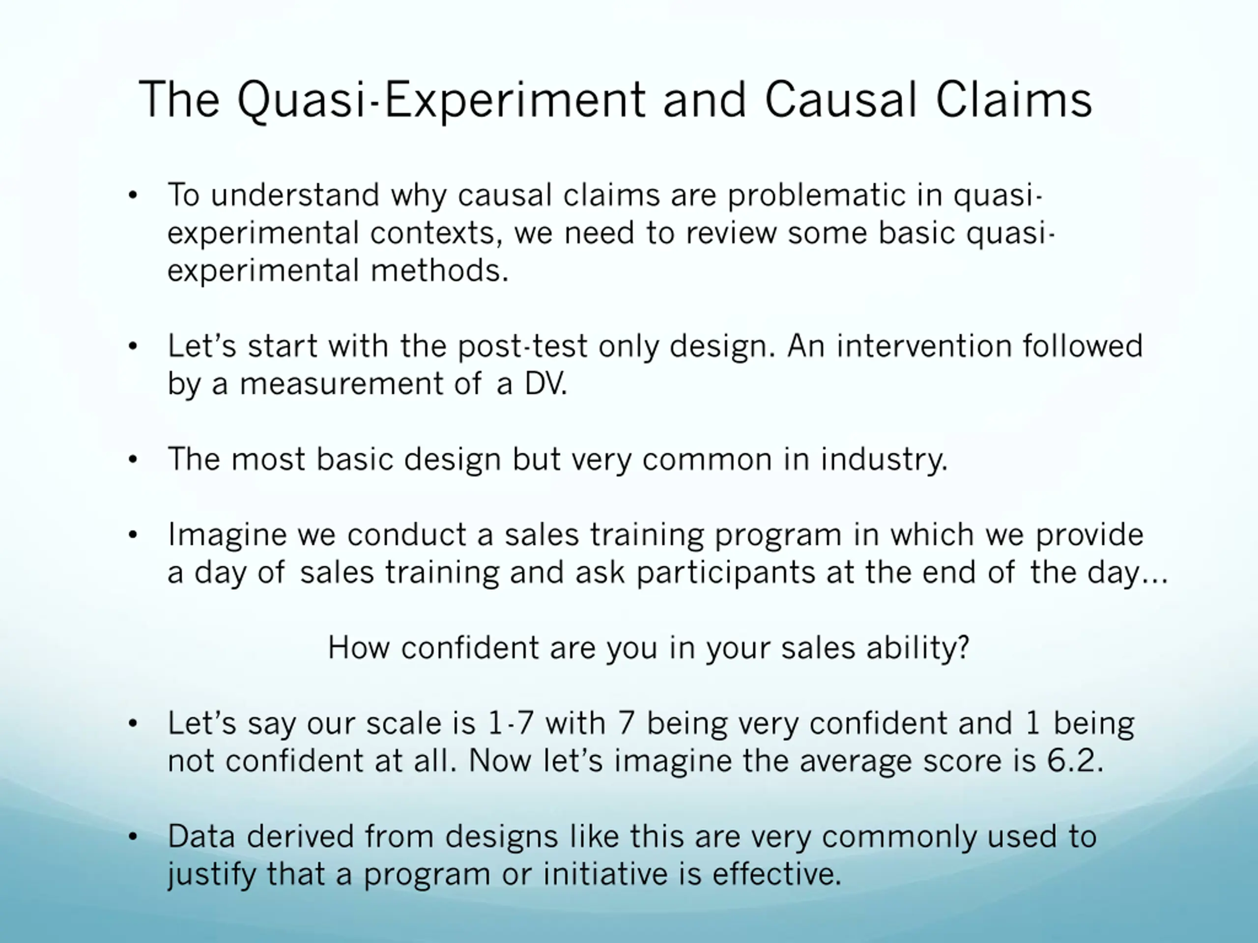 The Quasi-Experiment and Causal Claims To understand why causal claims are problematic in quasi- experimental contexts, we need to review some basic quasi- experimental methods. Let s start with the post-test only design. An intervention followed by a measurement of a DV. The most basic design but very common in industry. Imagine we conduct a sales training program in which we provide a day of sales training and ask participants at the end of the day How confident are you in your sales ability? Let s say our scale is 1-7 with 7 being very confident and 1 being not confident at all. Now let s imagine the average score is 6.2. Data derived from designs like this are very commonly used to justify that a program or initiative is effective.