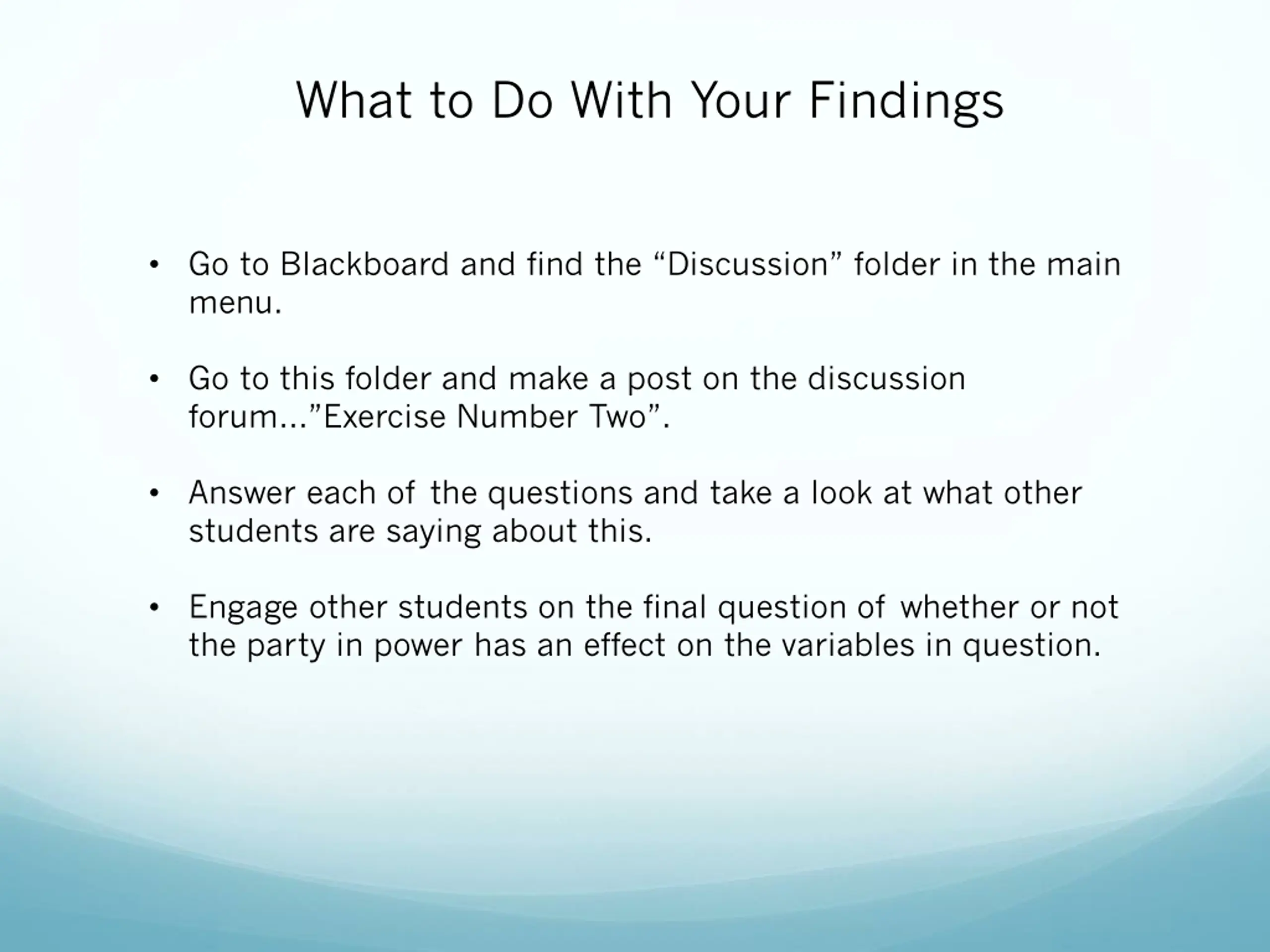 What to Do With Your Findings Go to Blackboard and find the Discussion folder in the main menu. Go to this folder and make a post on the discussion forum Exercise Number Two . Answer each of the questions and take a look at what other students are saying about this. Engage other students on the final question of whether or not the party in power has an effect on the variables in question.