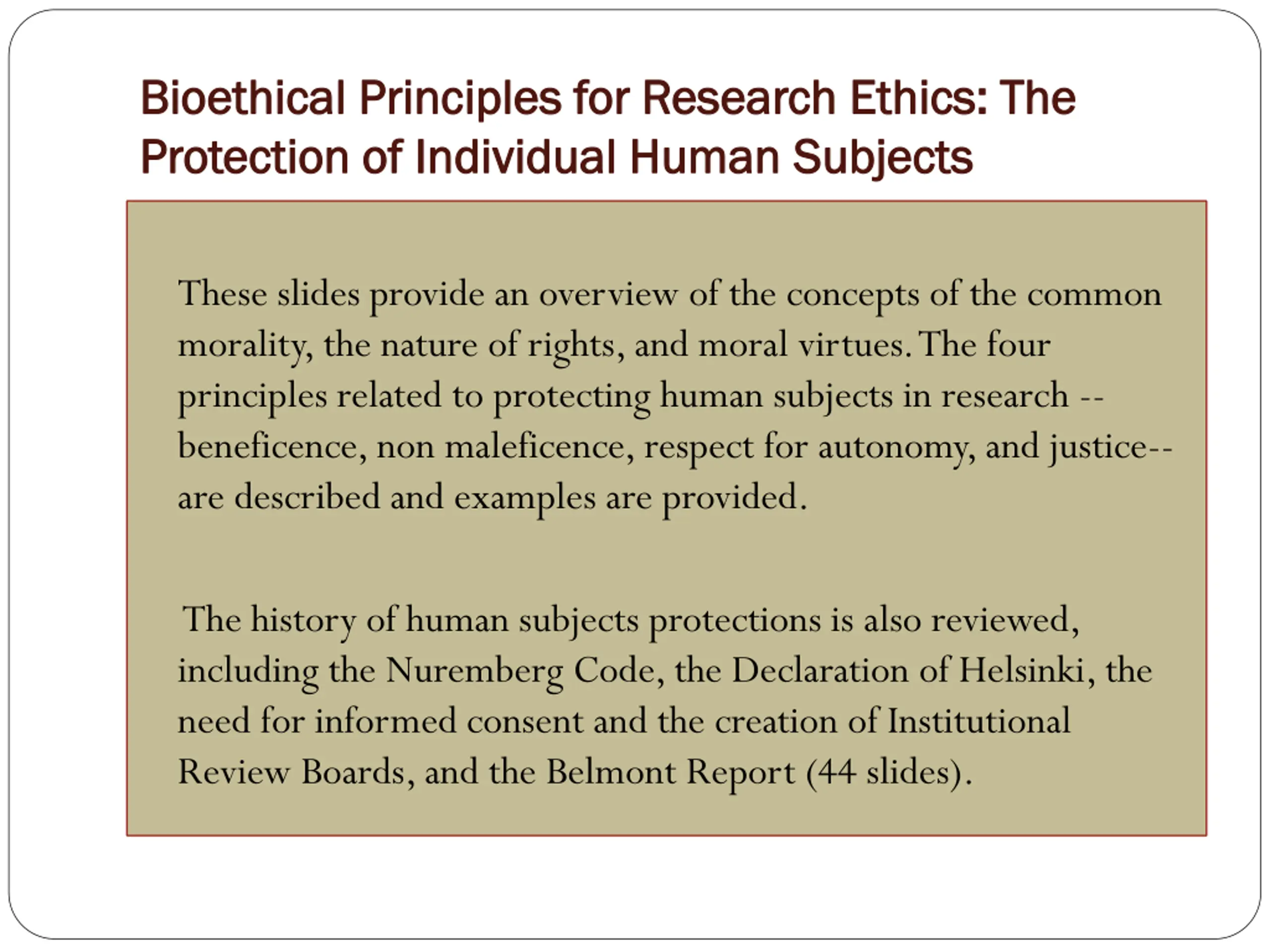 Bioethical Bioethical Principles for Research Ethics: The Principles for Research Ethics: The Protection of Individual Human Protection of Individual Human Subjects Subjects These slides provide an overview of the concepts of the common morality, the nature of rights, and moral virtues. The four principles related to protecting human subjects in research -- beneficence, non maleficence, respect for autonomy, and justice-- are described and examples are provided. The history of human subjects protections is also reviewed, including the Nuremberg Code, the Declaration of Helsinki, the need for informed consent and the creation of Institutional Review Boards, and the Belmont Report (44 slides).