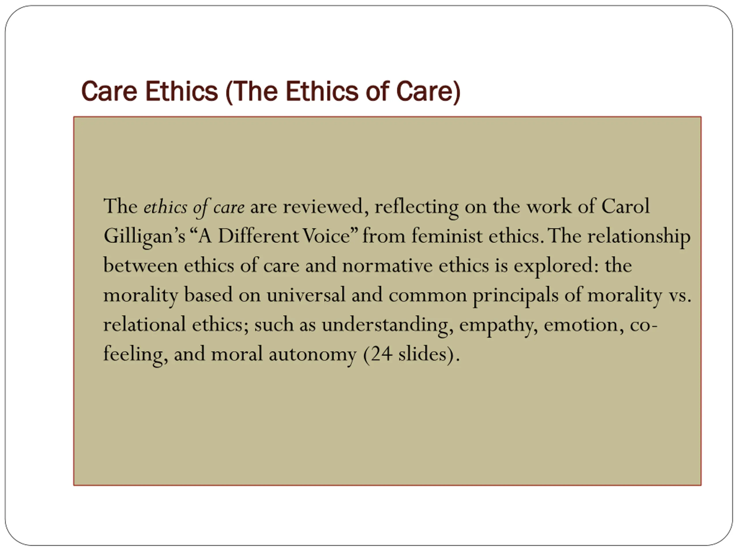 Care Ethics (The Ethics of Care) Care Ethics (The Ethics of Care) The ethics of care are reviewed, reflecting on the work of Carol Gilligan s A Different Voice from feminist ethics. The relationship between ethics of care and normative ethics is explored: the morality based on universal and common principals of morality vs. relational ethics; such as understanding, empathy, emotion, co- feeling, and moral autonomy (24 slides).