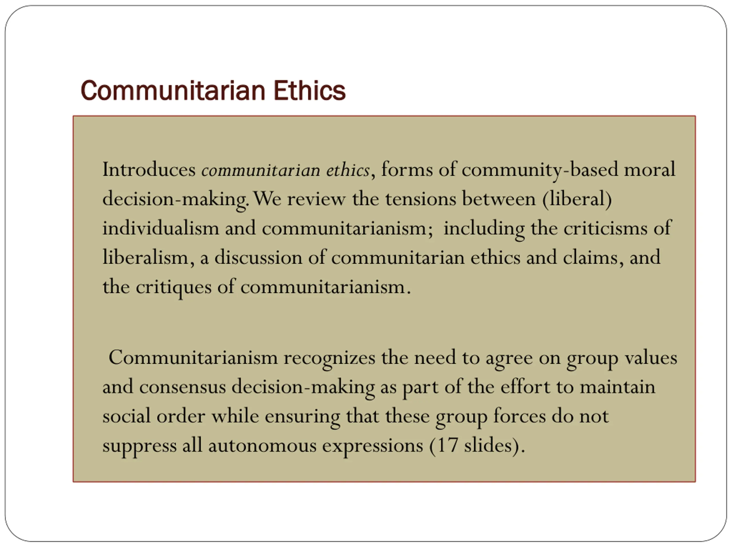 Communitarian Ethics Communitarian Ethics Introduces communitarian ethics, forms of community-based moral decision-making. We review the tensions between (liberal) individualism and communitarianism; including the criticisms of liberalism, a discussion of communitarian ethics and claims,and the critiques of communitarianism. Communitarianism recognizes the need to agree on group values and consensus decision-making as part of the effort to maintain social order while ensuring that these group forces do not suppress all autonomous expressions (17 slides).