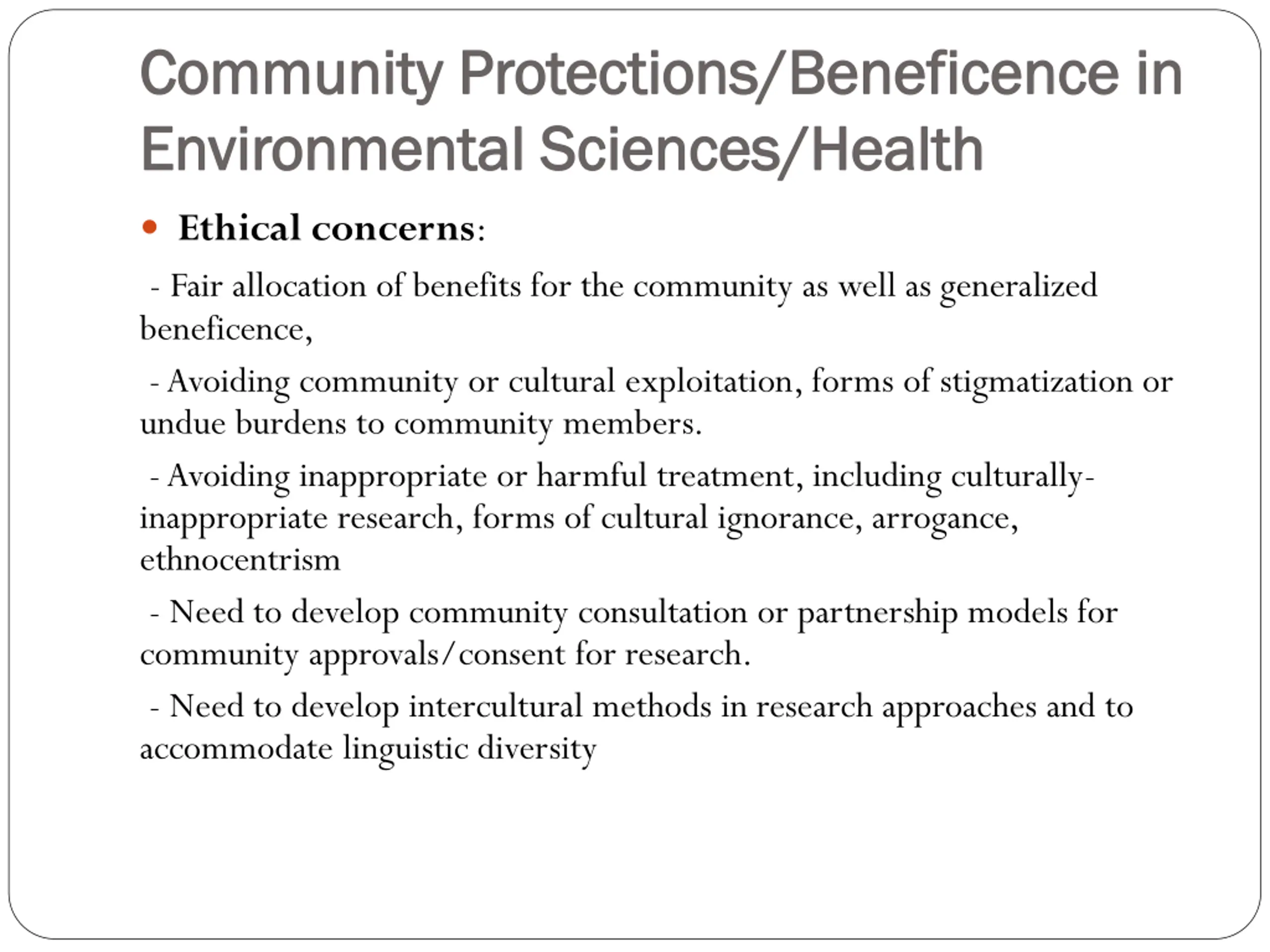 Community Protections/Beneficence in Community Protections/Beneficence in Environmental Sciences/Health Environmental Sciences/Health Ethical concerns: - Fair allocation of benefits for the community as well as generalized beneficence, -Avoiding community or cultural exploitation, forms of stigmatization or undue burdens to community members. -Avoiding inappropriate or harmful treatment, including culturally- inappropriate research, forms of cultural ignorance, arrogance, ethnocentrism - Need to develop community consultation or partnership models for community approvals/consent for research. - Need to develop intercultural methods in research approaches and to accommodate linguistic diversity